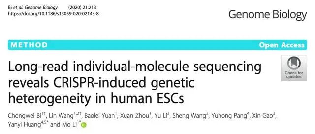 2020年8月25日,沙特阿拉伯阿卜杜拉國(guó)王科技大學(xué)(KAUST)生物與環(huán)境科學(xué)工程學(xué)院的李墨(Mo Li)教授和北京大學(xué)生物醫(yī)學(xué)前沿創(chuàng)新中心(BIOPIC)、北京未來(lái)基因診斷高精尖創(chuàng)新中心(ICG)的黃巖誼教授合作在Genome Biology上發(fā)表了題為L(zhǎng)ong-read individual-molecule sequencing reveals CRISPR-induced genetic heterogeneity in human ESCs的文章【3】。該研究提出了一種基于分子標(biāo)簽(unique molecular identifier, UMI)的單分子標(biāo)記技術(shù)(targeted Individual DNA Molecule Sequencing, IDMseq),用于定量的檢測(cè)樣品中的罕見(jiàn)突變,包括單堿基突變以及大范圍的復(fù)雜的結(jié)構(gòu)變異。