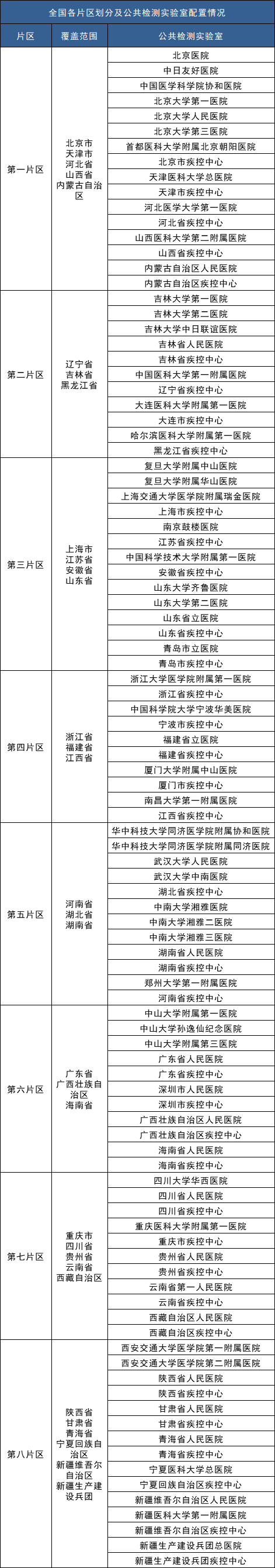綜合人口、醫(yī)療衛(wèi)生資源布局及地理交通等因素,將全國劃分為8個片區(qū),統(tǒng)籌片區(qū)內公共檢測實驗室、較大規(guī)模的第三方實驗室等作為機動檢測隊伍,每個片區(qū)形成50萬—70萬份/天的機動核酸檢測能力。全國各片區(qū)劃分及公共檢測實驗室配置情況見附件。
