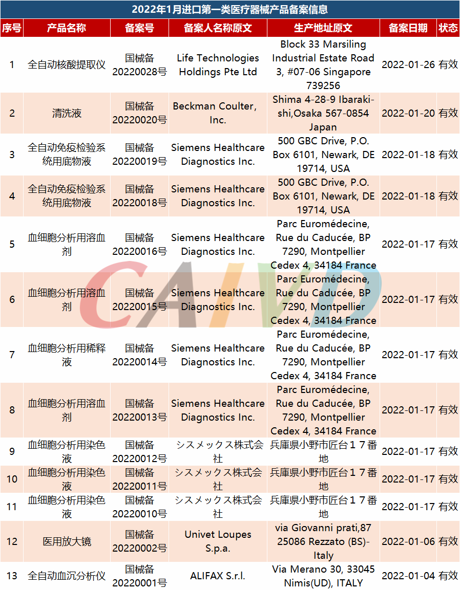 2022年1月,國(guó)家藥品監(jiān)督管理局共備案進(jìn)口第一類(lèi)醫(yī)療器械產(chǎn)品116個(gè)。其中,體外診斷相關(guān)產(chǎn)品13個(gè),具體產(chǎn)品如下: