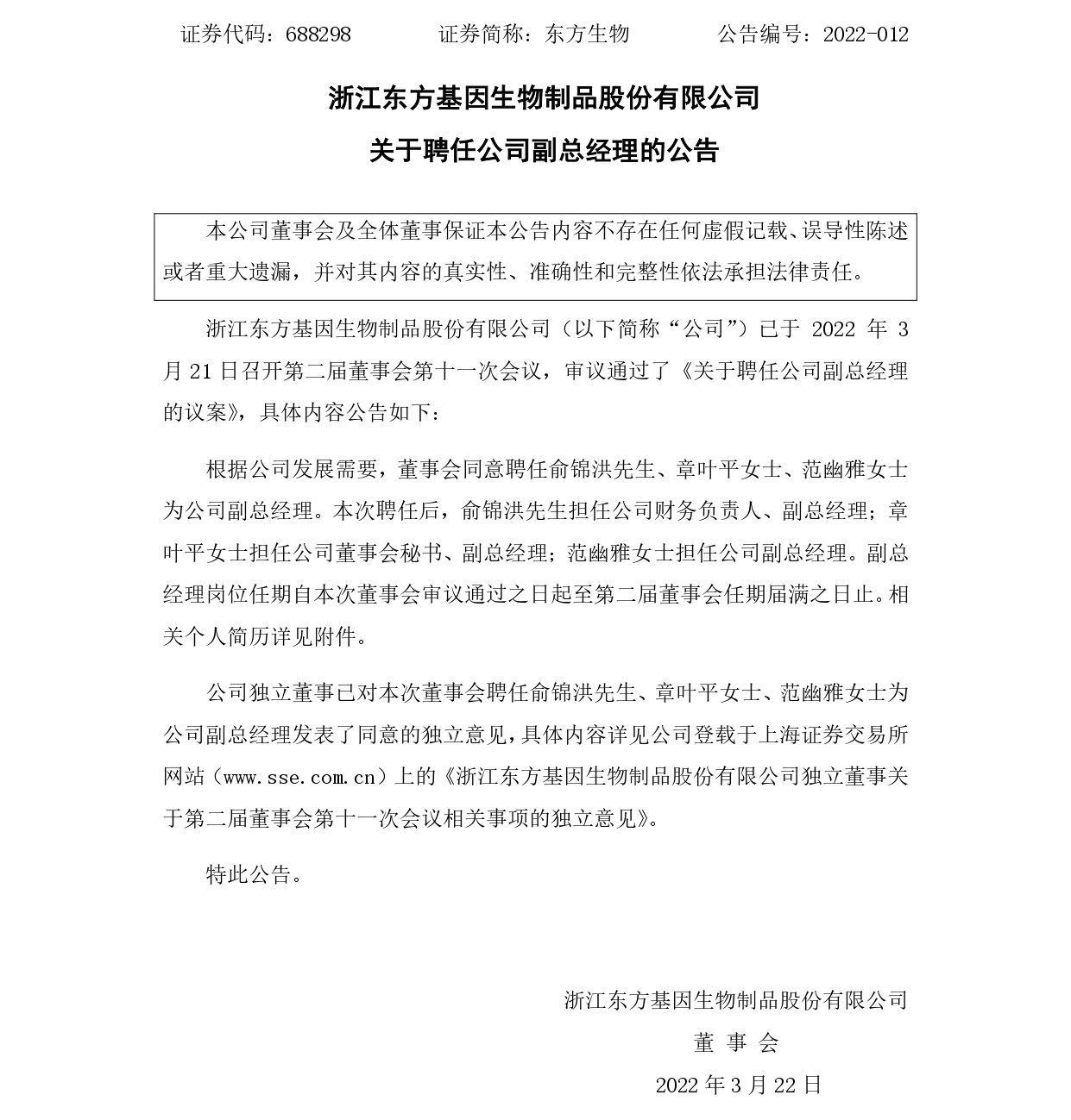 東方生物公告,公司董事會(huì)同意聘任俞錦洪先生、章葉平女士、范幽雅女士為公司副總經(jīng)理。本次聘任后,俞錦洪先生擔(dān)任公司財(cái)務(wù)負(fù)責(zé)人、副總經(jīng)理;章葉平女士擔(dān)任公司董事會(huì)秘書(shū)、副總經(jīng)理;范幽雅女士擔(dān)任公司副總經(jīng)理。