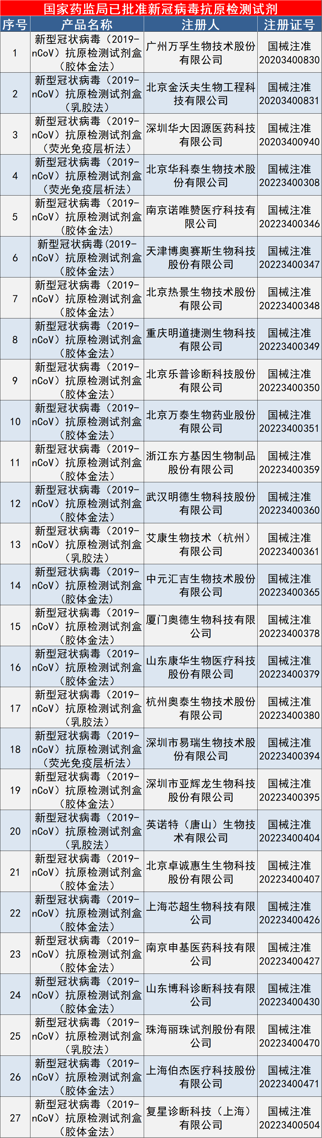4月13日,國(guó)家藥監(jiān)局批準(zhǔn)了復(fù)星診斷科技(上海)有限公司新型冠狀病毒(2019-nCoV)抗原檢測(cè)試劑盒(膠體金法)(國(guó)械注準(zhǔn)20223400504)。截至目前,國(guó)家藥監(jiān)局已批準(zhǔn)27個(gè)新冠病毒抗原檢測(cè)試劑產(chǎn)品。