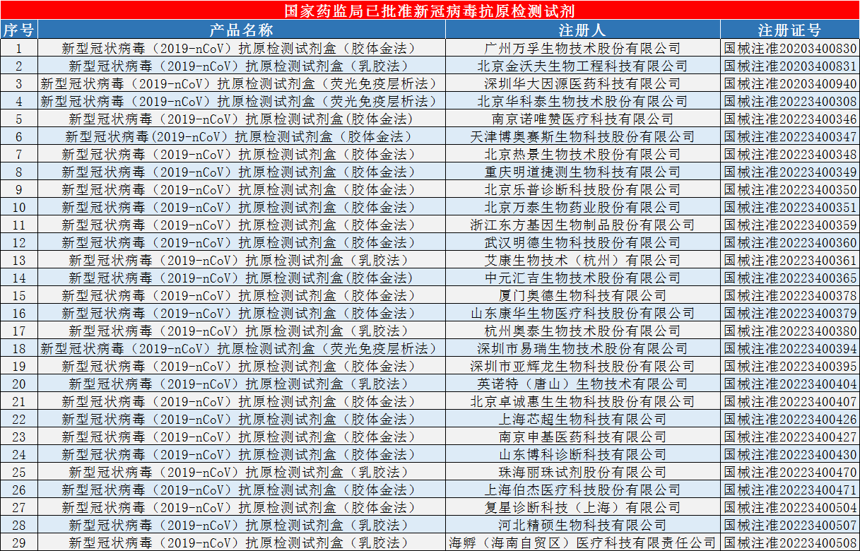 目前經(jīng)過NMPA批準(zhǔn)的新冠病毒抗原檢測的產(chǎn)品已達(dá)29個,具體為以下企業(yè)獲證: