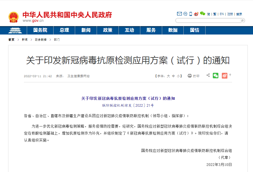 為進(jìn)一步優(yōu)化新冠病毒檢測策略,根據(jù)疫情防控需要,國務(wù)院聯(lián)防聯(lián)控機(jī)制綜合組研究決定,推進(jìn)“抗原篩查、核酸診斷”的監(jiān)測模式,在核酸檢測基礎(chǔ)上增加抗原檢測作為補(bǔ)充。2022年3月10日,機(jī)制綜合組制定印發(fā)了《新冠病毒抗原檢測應(yīng)用方案(試行)》(以下簡稱《方案》),要求各地認(rèn)真組織實施。