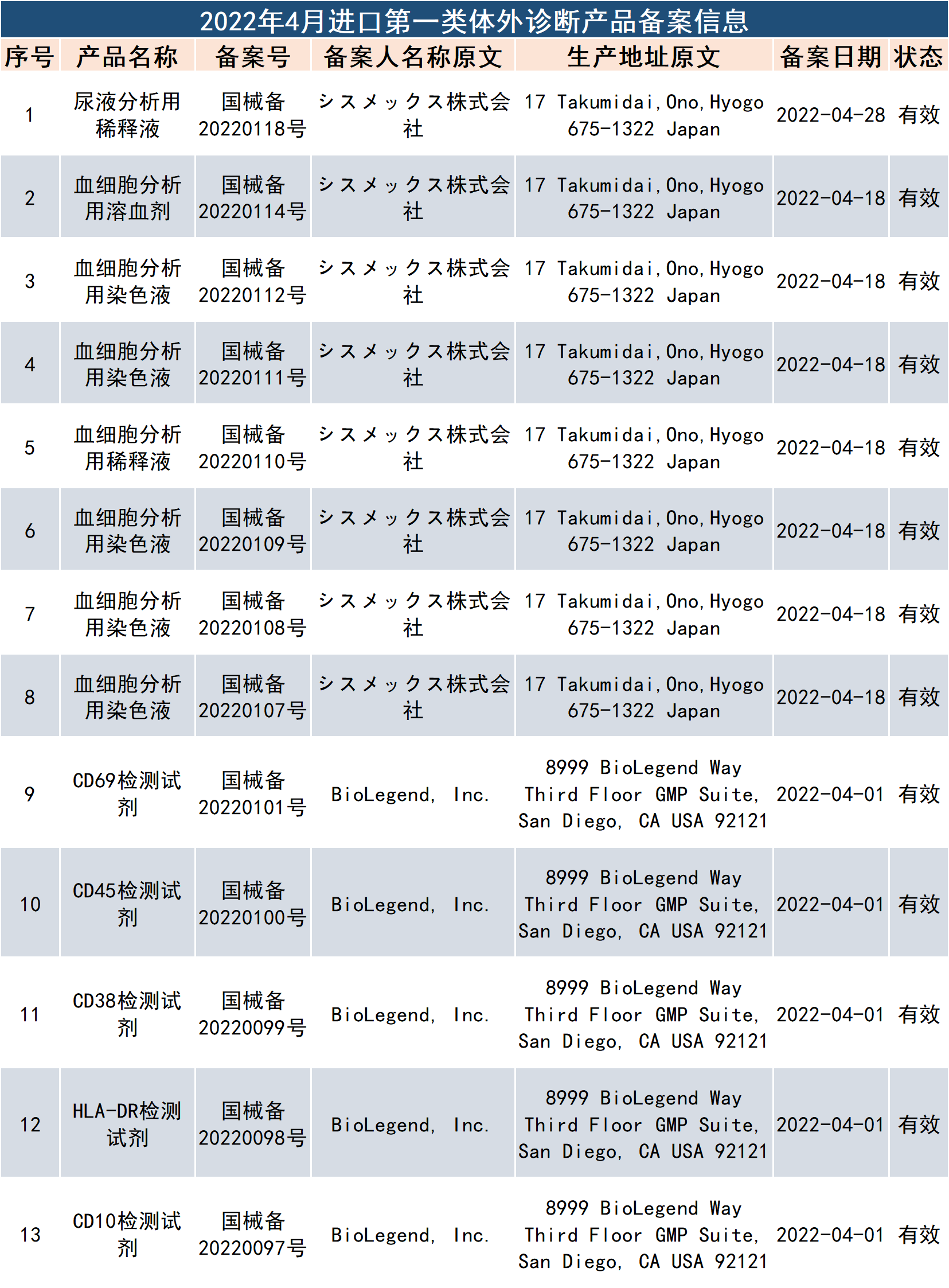 2022年4月,國家藥品監(jiān)督管理局共備案進(jìn)口第一類醫(yī)療器械產(chǎn)品120個(gè)。其中,體外診斷新備案相關(guān)產(chǎn)品13個(gè),具體產(chǎn)品如下: