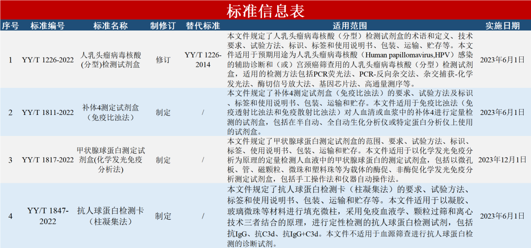 5月20日。國家藥監(jiān)局發(fā)布公告,人乳頭瘤病毒核酸(分型)檢測試劑盒、補體4測定試劑盒(免疫比濁法)、甲狀腺球蛋白測定試劑盒(化學(xué)發(fā)光免疫分析法)、抗人球蛋白檢測卡(柱凝集法)已經(jīng)審定通過,現(xiàn)予以公布。標(biāo)準(zhǔn)編號、名稱、適用范圍和實施日期如下。