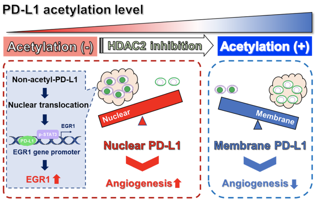 范先群院士團(tuán)隊(duì)多年來(lái)致力于葡萄膜黑色素瘤的臨床治療和基礎(chǔ)研究。依托臨床樣本資源,研究人員首先發(fā)現(xiàn)UM中細(xì)胞核PD-L1表達(dá)水平升高,且與不良預(yù)后相關(guān)。進(jìn)一步研究發(fā)現(xiàn),細(xì)胞核PD-L1對(duì)UM細(xì)胞的增殖和遷移能力無(wú)明顯影響,但能顯著促進(jìn)細(xì)胞促血管化能力。這種現(xiàn)象的機(jī)制是什么呢?應(yīng)用CUT&Tag和RNA-seq聯(lián)合分析,發(fā)現(xiàn)細(xì)胞核PD-L1可以轉(zhuǎn)錄激活促血管化因子EGR1的表達(dá);機(jī)制研究發(fā)現(xiàn),細(xì)胞核PD-L1促進(jìn)了p-STAT3在EGR1啟動(dòng)子區(qū)的結(jié)合,從而激活EGR1表達(dá)。HDAC2抑制劑能夠恢復(fù)UM中PD-L1的乙;,阻止其入核,從而降低EGR1的表達(dá),抑制UM細(xì)胞促血管化能力。因此,抗PD-L1免疫治療聯(lián)合HDAC2抑制劑減弱UM的腫瘤血管生成,提出了一種新的抗腫瘤治療策略。