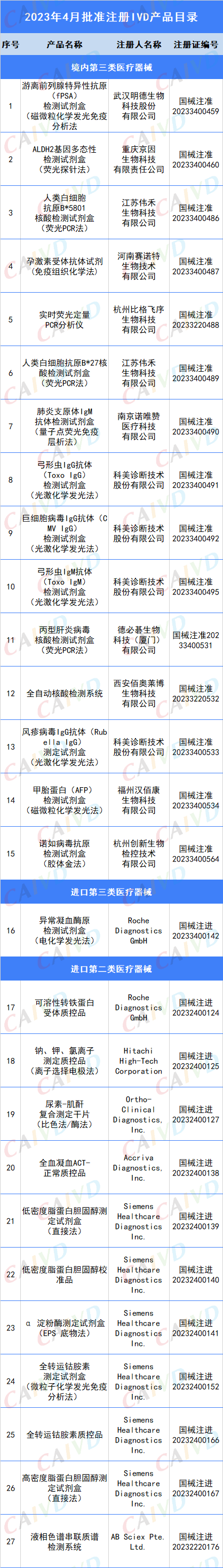 其中IVD產(chǎn)品共27個(gè),境內(nèi)第三類醫(yī)療器械15個(gè),進(jìn)口第三類醫(yī)療器械1個(gè),進(jìn)口第二類醫(yī)療器械11個(gè),詳見下表。