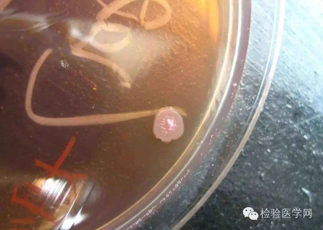 麥康凱平板上,中心粗糙型,似”花蕊”狀結(jié)構(gòu)。后經(jīng)鑒定為大腸埃希菌