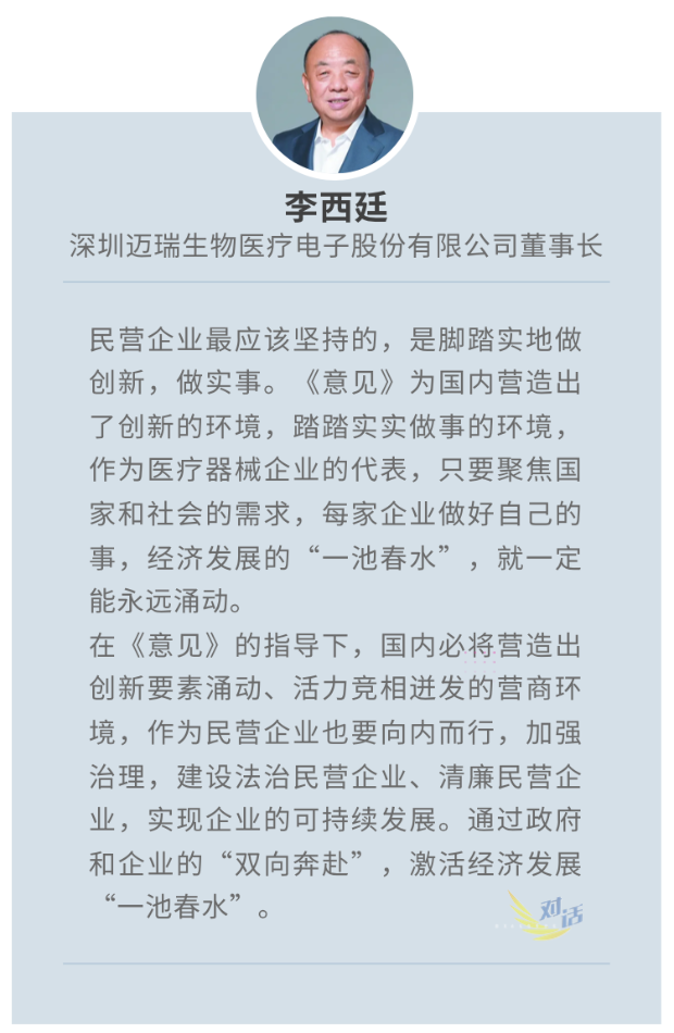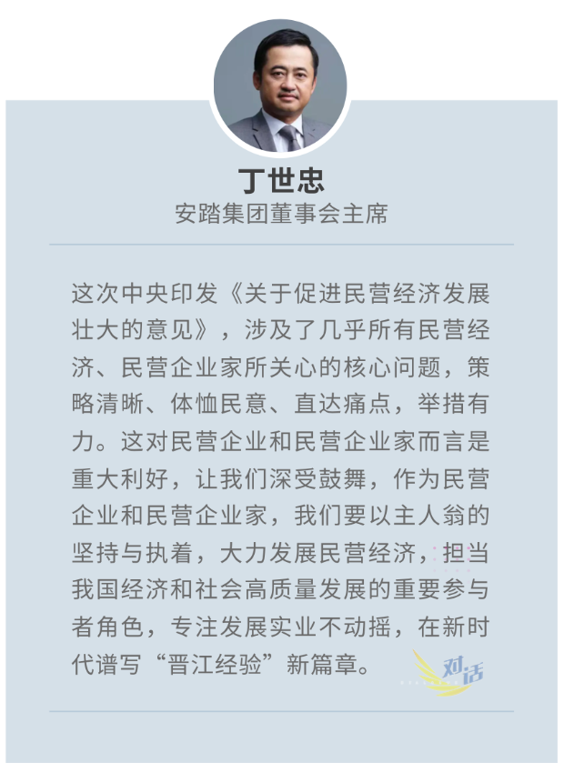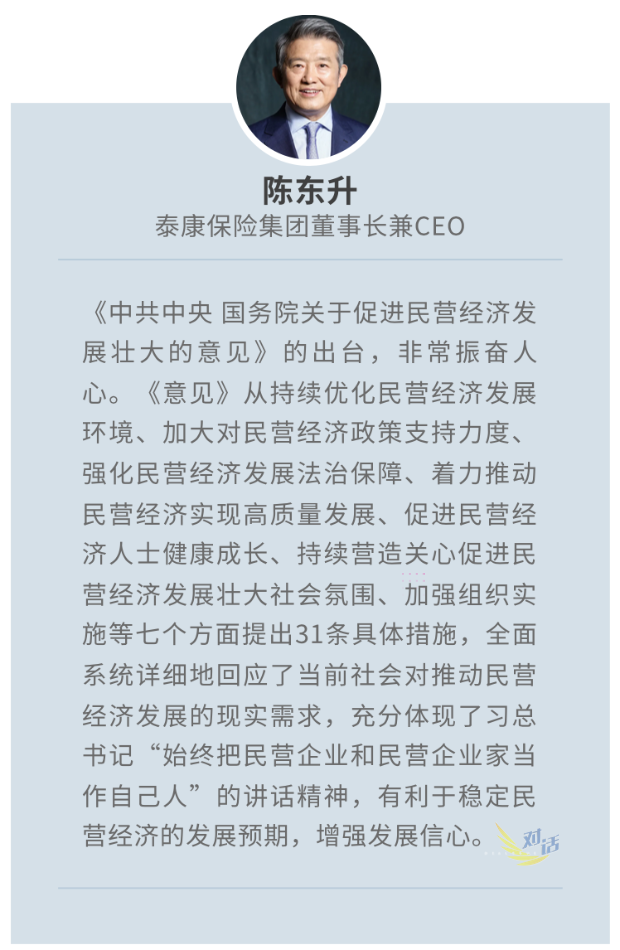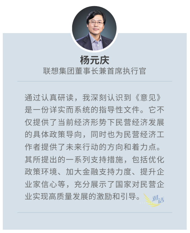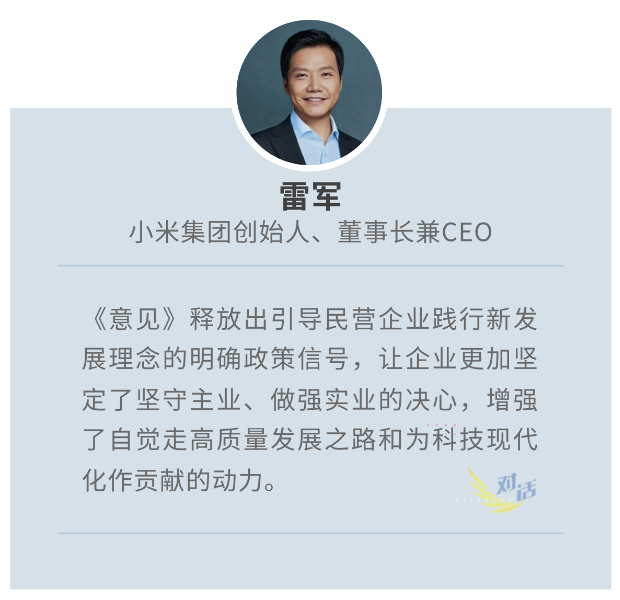 在這一重磅文件發(fā)布后,《對話》第一時間邀請十七位民營企業(yè)家和一位專家,以文字或視頻的形式共同發(fā)聲。宗慶后、馬化騰、王健林、李書福、李東生、楊元慶、潘剛、南存輝、丁世忠、雷軍、劉永好、向文波、徐冠巨、陳東升、趙佳臻、李西廷、張陽、李兆前,紛紛表示備受振奮和鼓舞。