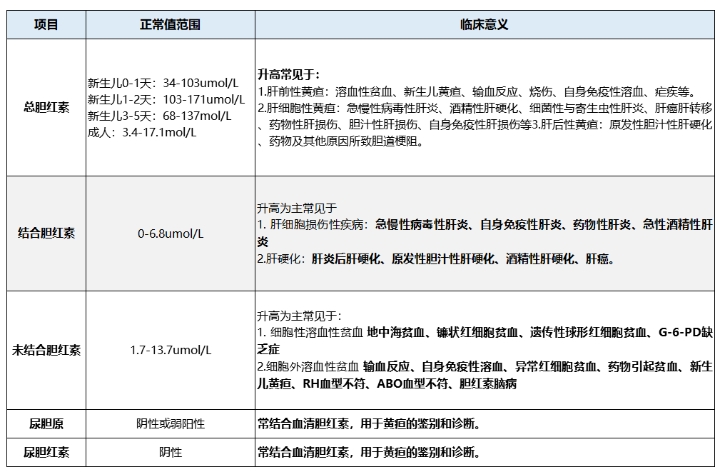 特別說明:一般來說小于34μmol/L的黃疸,視診不易察出,稱為隱性黃疽;34~170μmol/L為輕度黃疽;170~340μmol/L為中度黃疸;>340μmol/L為高度黃疸。
