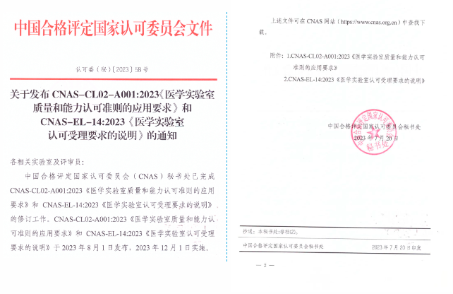 8月1日,中國合格評定國家認(rèn)可委員會發(fā)布《關(guān)于發(fā)布CNAS-CL02-A001:2023〈醫(yī)學(xué)實(shí)驗(yàn)室質(zhì)量和能力認(rèn)可準(zhǔn)則的應(yīng)用要求》和CNAS-EL-14:2023《醫(yī)學(xué)實(shí)驗(yàn)室認(rèn)可受理要求的說明〉的通知》。該文件將代替CNAS-CL02-A001:2021《醫(yī)學(xué)實(shí)驗(yàn)室質(zhì)量和能力認(rèn)可準(zhǔn)則的應(yīng)用要求》,并于2023年12月1日起正式實(shí)施。