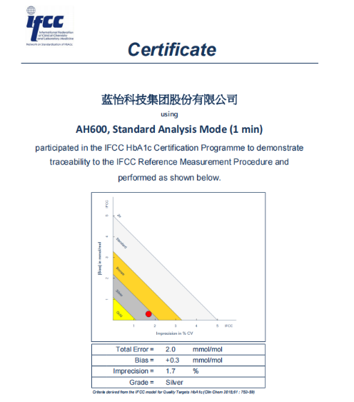 創(chuàng)新迭代,未曾停止:藍(lán)怡AH-600經(jīng)過優(yōu)化更新,今年喜獲IFCC“銀牌”認(rèn)證,檢測系統(tǒng)誤差(TE)由“2.3 mmol/mol”降低為“2.0 mmol/mol”,這意味著AH-600儀器的檢測性能又上升一水平,同時,藍(lán)怡制造也步入高端行列,AH-600的性能,已經(jīng)完全可以媲美進(jìn)口一線品牌。