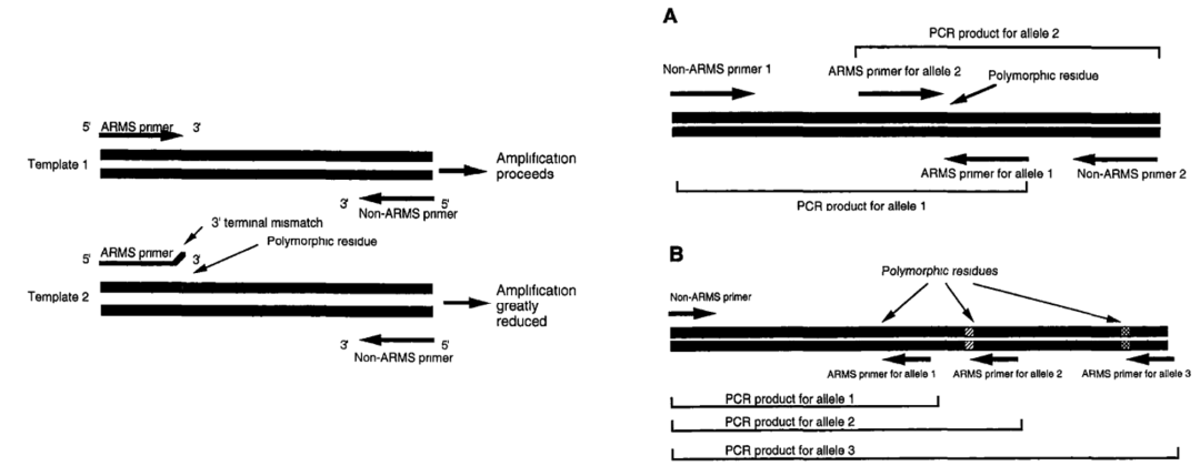 ARMS PCR引物設(shè)計時等位基因兩條上游引物中3’端核苷酸不同,兩條引物分別對野生型和突變型進(jìn)行特異性擴增時,與模板不能完全匹配的上游引物將不能與模板完全形成互補堿基對,形成錯配,一方面,堿基錯配會影響產(chǎn)物延伸,另一方面,錯配堿基會改變等位基因變體的退火溫度,最終導(dǎo)致不同基因型擴增效果的差異,對差異進(jìn)行檢測即可確認(rèn)基因型。