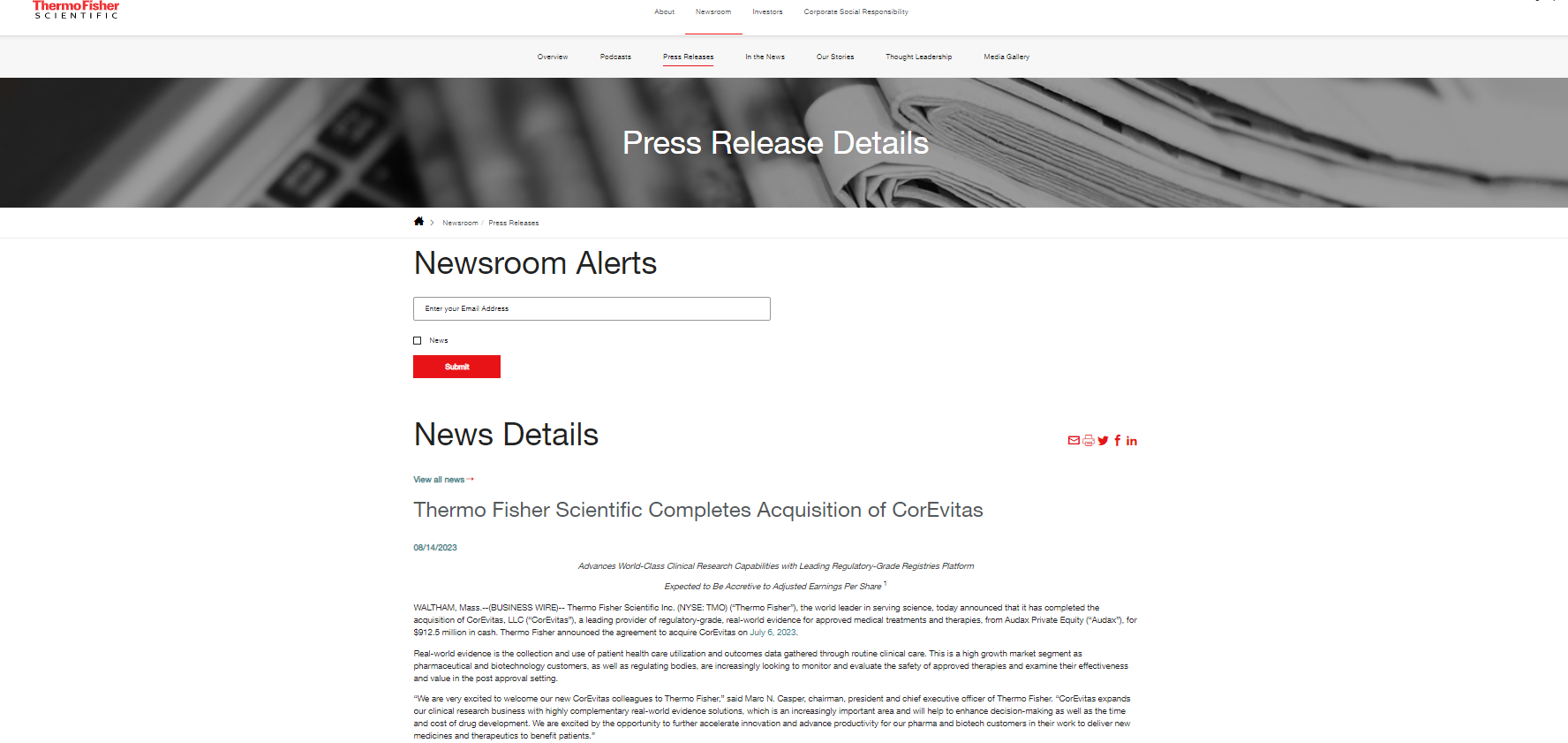 馬薩諸塞州沃爾瑟姆--(美國(guó)商業(yè)資訊)--服務(wù)于科學(xué)領(lǐng)域的全球領(lǐng)先企業(yè)賽默飛世爾科技公司(紐約證券交易所股票代碼:TMO)(以下簡(jiǎn)稱 "賽默飛")于當(dāng)?shù)貢r(shí)間8月14日宣布,已完成以9.125億美元現(xiàn)金從Audax Private Equity(以下簡(jiǎn)稱 "Audax")手中收購(gòu)CorEvitas, LLC(以下簡(jiǎn)稱 "CorEvitas")的交易。賽默飛于2023年7月6日宣布了收購(gòu)CorEvitas的協(xié)議。