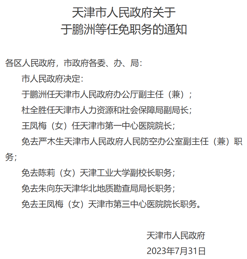 2023年08月16日,天津市人民政府官網(wǎng)發(fā)布一則任免職務(wù)的通知。