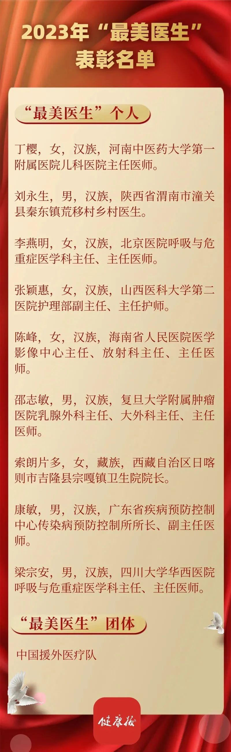 為深入學(xué)習(xí)貫徹習(xí)近平新時(shí)代中國(guó)特色社會(huì)主義思想,大力弘揚(yáng)崇高職業(yè)精神、偉大抗疫精神、中國(guó)醫(yī)療隊(duì)精神,在中國(guó)援外醫(yī)療隊(duì)派遣60周年和第六個(gè)“中國(guó)醫(yī)師節(jié)”到來(lái)之際,中央宣傳部、國(guó)家衛(wèi)生健康委向全社會(huì)公開(kāi)發(fā)布2023年“最美醫(yī)生”先進(jìn)事跡。