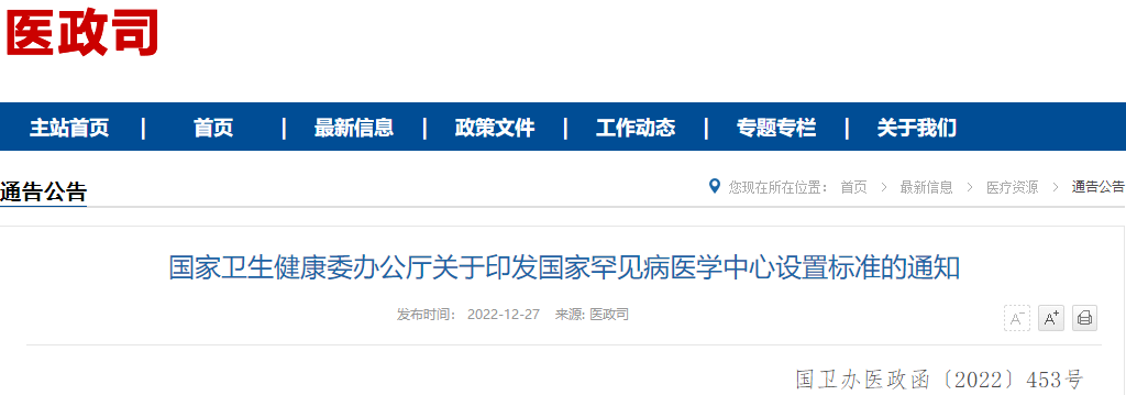 早在2022年12月20日,國家衛(wèi)健委辦公廳發(fā)布了《國家衛(wèi)生健康委辦公廳關(guān)于印發(fā)國家罕見病醫(yī)學(xué)中心設(shè)置標(biāo)準(zhǔn)的通知》
