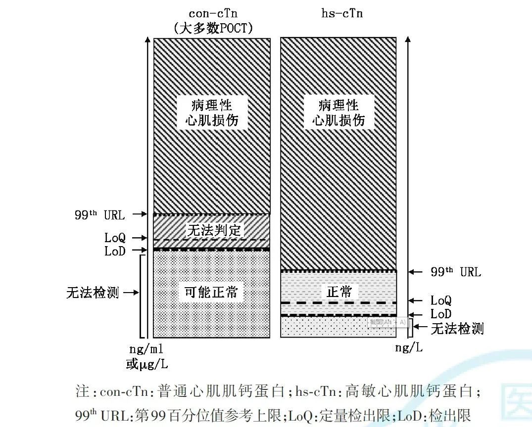 5.99th URL:指將表觀健康人的cTn濃度值從小至大排列,處于第99位(具體為第99位與第100位的均值)的cTn濃度值稱為表觀健康人第99百分位值。由于cTn是一個連續(xù)變量,不存在完全區(qū)分正常和心肌梗死的單一切點值,因此將表觀健康人99th URL作為公認的醫(yī)學決定限,以前的目的是減少假陽性率,現(xiàn)在是要早期發(fā)現(xiàn)AMI和能發(fā)現(xiàn)(檢出)微小的AMI,這必將縮小AMI臨床診斷與病理學診斷間的差距,有利于臨床提前干預,使患者獲益[4],F(xiàn)階段根據(jù)檢測性能將cTn檢測方法大致分為兩類:即高敏和普通,后者包括絕大部分POCT檢測方法(圖2)。兩類檢測方法的主要區(qū)別是:第99百分位值處總CV和健康人群中能檢出超過LoD的比例。(1)hs-cTn檢測法:檢測性能要求:①在不少于50%的健康男性和女性人群中均能夠穩(wěn)定可靠地檢測到cTn,并且cTn濃度等于或高于LoD;②在性別特異性99th URL濃度下的總CV≤10%。(2)普通心肌肌鈣蛋白(con-cTn)檢測法:檢測性能要求:①在20%~50%健康人群中能夠檢測到cTn,并且cTn濃度等于或高于LoD;②99th URL濃度下的總CV≤10%(由于檢測敏感性不夠,故不具備分設(shè)男女99th URL的能力)為指南可接受,總CV≤20%為臨床可接受。(3)POCT心肌肌鈣蛋白檢測法(POCT-cTn):POCT主要特點是及時、即地,且可由非檢驗專業(yè)人員操作。需注意絕大多數(shù)POCT-cTn在正常人群中檢出率都非常低,且99th URL濃度下的CV較大。根據(jù)2018版AMI通用定義,20%的cTn水平變化是鑒別急性和慢性心肌損傷的關(guān)鍵,因此99th URL濃度下的總CV≤20%為臨床可接受,如果CV>20%則不可接受(容易造成假陰性或假陽性)。