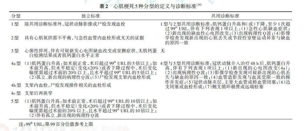 1.AMI診斷:需要強調(diào)cTn高于99th URL是診斷AMI的必要條件,但不是唯一條件。臨床診斷AMI必須有臨床缺血證據(jù)支持,無臨床缺血證據(jù)的cTn急性升高或降低,不能診斷為AMI。在數(shù)小時或數(shù)天內(nèi)動態(tài)監(jiān)測cTn變化在診斷AMI中也非常重要,升高或降低的變化在診斷AMI中的臨床意義是一致的,取決于采血的時機。應用hs-cTn變化值診斷AMI時,絕對變化優(yōu)于相對變化[16]。連續(xù)監(jiān)測時,hs-cTn表現(xiàn)為升高還是下降取決于采血時機和病程,通常AMI發(fā)生時,hs-cTn快速升高,然后緩慢下降,其幅度部分取決于血管閉塞情況和梗死面積[17, 18]。2018年第4版全球AMI通用定義中的5種類型AMI診斷標準詳見表2。AMI診斷標準包括:cTnT或cTnI(首選hs-cTn)水平升高和(或)降低,且至少有1次超過健康人99th URL,并伴有至少1種臨床缺血證據(jù):(1)急性心肌缺血的癥狀;(2)新發(fā)心電圖缺血性改變;(3)心電圖出現(xiàn)病理性Q波;(4)影像學證據(jù)顯示存活心肌丟失或與缺血原因一致的節(jié)段性室壁運動異常;(5)血管造影或尸檢發(fā)現(xiàn)冠狀動脈內(nèi)血栓[10]。