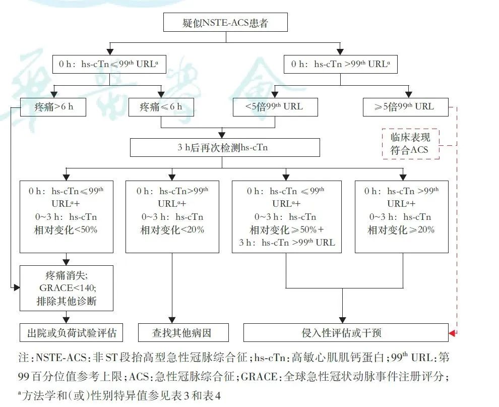 【推薦意見8】(1)所有疑似ACS患者均應檢測cTn,不同的診斷流程需要選擇特異性的診斷方法和界值。(2)0~1、0~2、0~3 h的快速診斷流程應采用hs-cTn檢測方法,并進行臨床驗證。(3)單次檢測hs-cTn低于LoD可安全排除胸痛時間超過3 h患者的AMI風險。(4)單次檢測con-cTn陰性,或低于LoD不可直接排除AMI,應在6 h后再次檢測,觀察其變化。