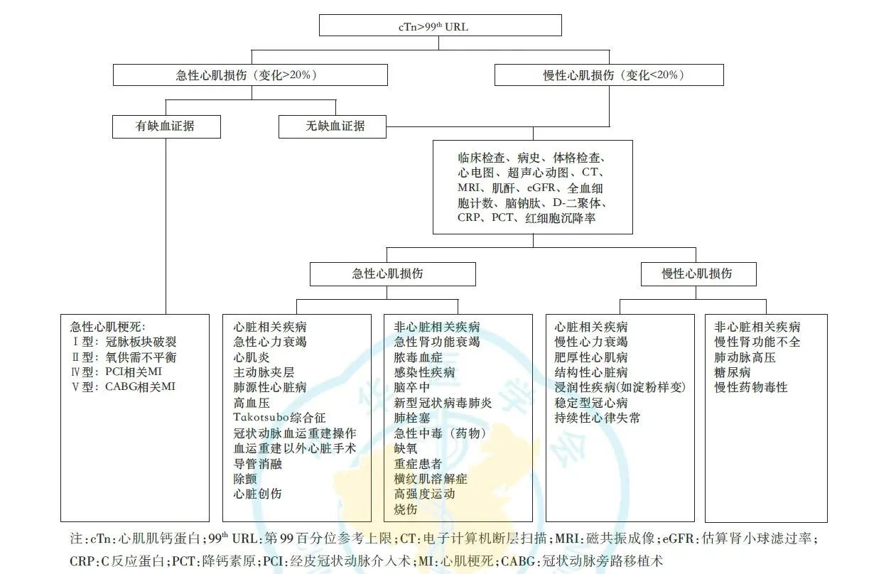 【推薦意見9】cTn高于99th URL,且變化幅度超過20%,考慮為急性心肌損傷;如持續(xù)升高狀態(tài),且增幅變化<20%,則可能為慢性心肌損傷。動態(tài)監(jiān)測結(jié)合臨床情況是明確心肌損傷病因的重要手段。心力衰竭、腎功能不全、全身性疾病、手術(shù)、感染甚至藥物治療均能導致心肌損傷,不同疾病的確診需要結(jié)合臨床情況。