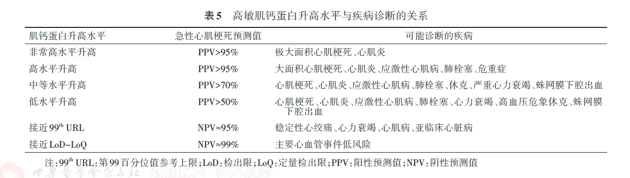 5.cTn用于診斷手術(shù)操作相關(guān)的心肌損傷:(1)心臟導管及手術(shù)相關(guān)的心肌損傷及圍手術(shù)期(術(shù)后48 h內(nèi))再發(fā)心肌梗死診斷:約1/3接受冠狀動脈介入手術(shù)的患者可出現(xiàn)手術(shù)相關(guān)的心肌損傷[55]。手術(shù)相關(guān)的心肌損傷定義:如術(shù)前cTn為正常水平,術(shù)后cTn超過99th URL;如術(shù)前cTn升高,則術(shù)后超過術(shù)前20%,可認為是手術(shù)操作相關(guān)的心肌損傷。應該分別在術(shù)前、術(shù)后3~6 h復查,如術(shù)后異常還應連續(xù)監(jiān)測發(fā)現(xiàn)峰值(>5倍99th URL)。只有術(shù)前cTn正常、術(shù)后處于穩(wěn)定的下降狀態(tài)患者,才能認為升高的cTn與手術(shù)相關(guān)。如果ACS患者即刻行經(jīng)皮冠狀動脈介入治療(PCI),且術(shù)前僅有1次cTn陰性或僅輕度升高,術(shù)后的cTn升高應該認為是疾病相關(guān)。冠狀動脈旁路移植術(shù)后圍手術(shù)期相關(guān)心肌梗死(5型心肌梗死)的診斷界值為10倍正常上限。另外,導管消融和經(jīng)皮瓣膜置換術(shù)也可導致心肌損傷,通常cTn水平不超過5型心肌梗死的定義,不伴有缺血的證據(jù)[56, 57]。診斷手術(shù)相關(guān)的心肌梗死不應以單獨的hs-cTn異常升高作為依據(jù),必須包括新的心電圖缺血證據(jù)、新的存活心肌丟失或室壁節(jié)段運動異常的影像學證據(jù)。(2)非心臟手術(shù)相關(guān)的心肌損傷:圍手術(shù)期心肌梗死是非心臟手術(shù)的重要并發(fā)癥且與不良預后相關(guān),但多數(shù)患者無缺血癥狀和心電圖改變[58, 59]。術(shù)前檢測cTn可發(fā)現(xiàn)是否存在慢性cTn升高的情況,以及術(shù)后是否存在cTn的變化。心臟疾病高;颊邞趪中g(shù)期監(jiān)測cTn水平,并基于術(shù)前水平判定急性還是慢性損傷。約35%的非心臟手術(shù)患者術(shù)后hs-cTn水平高于99th URL,與其預后相關(guān),術(shù)后hs-cTn峰值越高或較基線變化幅度越大,30 d死亡率越高[60]。但為避免誤診,診斷心肌梗死仍需依賴缺血的客觀證據(jù),如心電圖和影像學變化等。