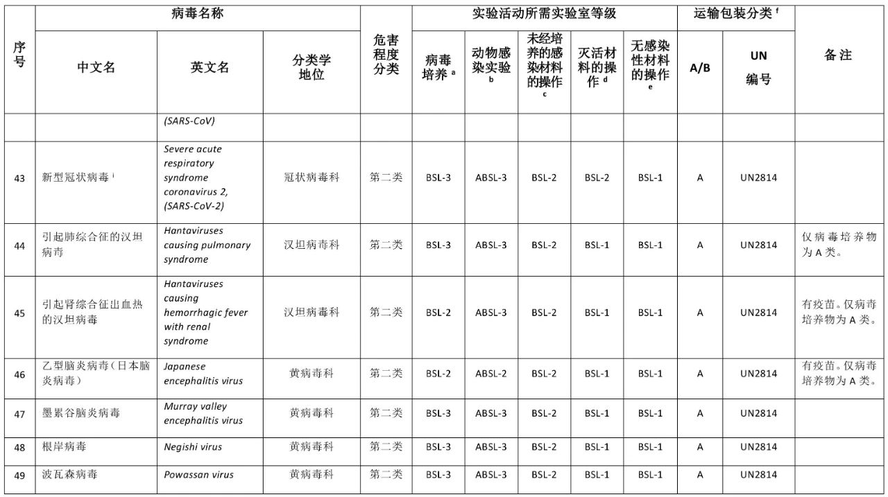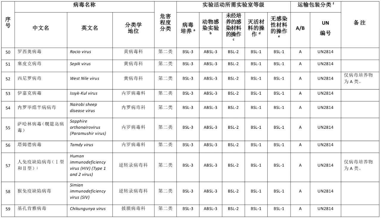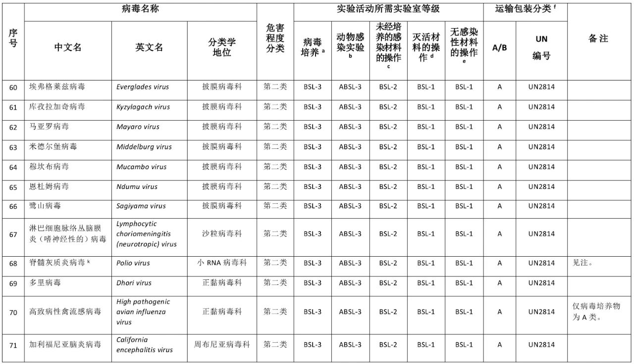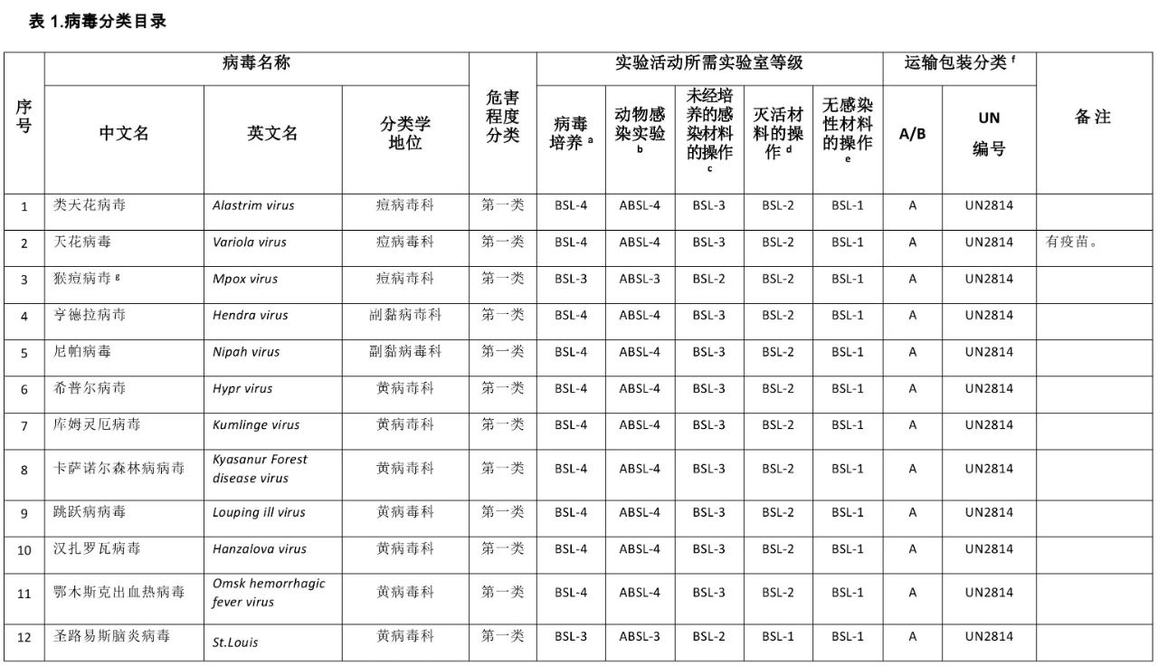 四是猴痘病毒“未經(jīng)培養(yǎng)的感染材料的操作”實驗活動所需實驗室等級由三級降為二級。駱駝痘病毒和登革病毒的聯(lián)合國危險貨物編號(UN編號)由“UN2814”修訂為“UN3373”,并且登革病毒的運輸包裝等級降為B類。H2N2流感病毒運輸包裝等級由B類升為A類。