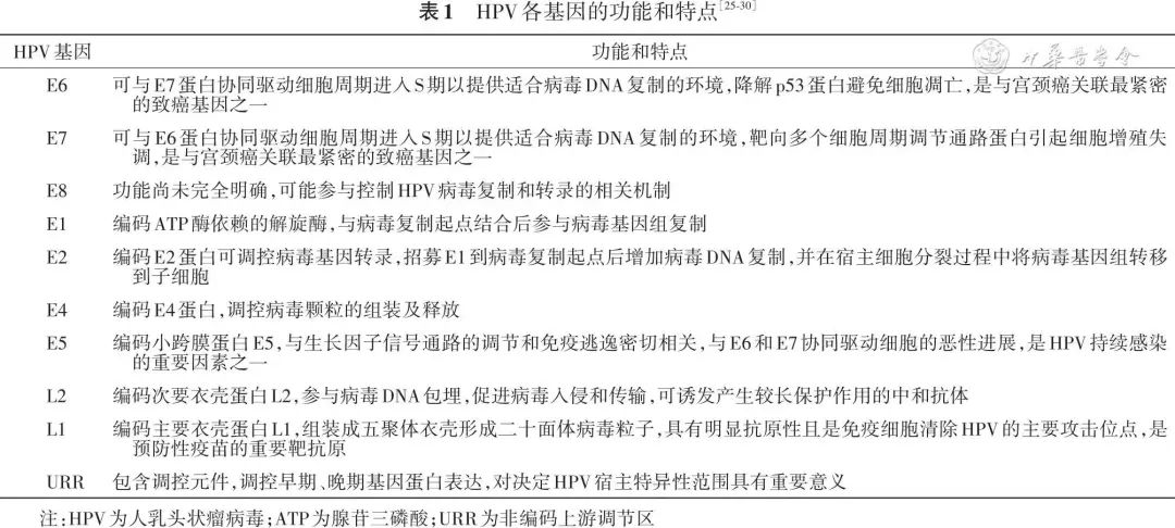 HPV是一種嗜上皮組織的無包膜雙鏈環(huán)狀小DNA病毒,病毒基因組約8 kb,可分為3個(gè)區(qū)域:早期基因(包含開放閱讀框E6、E7、E1、E8、E2、E4、E5)、晚期基因(包含開放閱讀框L2和L1),以及非編碼上游調(diào)節(jié)區(qū)(URR)又稱為長(zhǎng)控制區(qū)(LCR)(圖1),各基因的功能和特點(diǎn)見表1[25-30]。