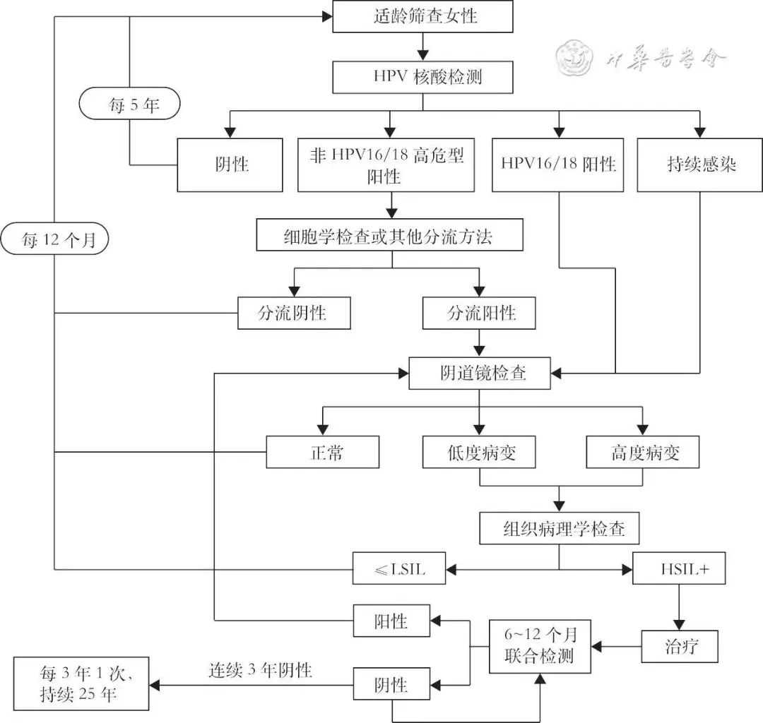 4. HPV篩查流程圖:對(duì)適齡女性采用HPV核酸檢測(cè)進(jìn)行初篩,陰性者間隔5年后再次進(jìn)行檢測(cè)。對(duì)HPV初篩陽性者采用HPV基因分型和細(xì)胞學(xué)檢測(cè)聯(lián)合分流方法:HPV16/18陽性者及HPV持續(xù)感染者直接轉(zhuǎn)診陰道鏡,非HPV16/18陽性者采用細(xì)胞學(xué)檢測(cè)進(jìn)一步分流。細(xì)胞學(xué)陰性者12個(gè)月后再次進(jìn)行HPV核酸檢測(cè),細(xì)胞學(xué)陽性者直接轉(zhuǎn)診陰道鏡。對(duì)陰道鏡檢查結(jié)果為低度及以上病變者行病理檢查,病理結(jié)果為宮頸正;虻图(jí)別鱗狀上皮內(nèi)病變者(≤LSIL)12個(gè)月后再次進(jìn)行HPV核酸檢測(cè),病理結(jié)果為HSIL+者進(jìn)行治療,并在6~12個(gè)月后采用HPV核酸及細(xì)胞學(xué)聯(lián)合檢測(cè)進(jìn)行隨訪,結(jié)果陽性者轉(zhuǎn)診陰道鏡,陰性者每年進(jìn)行1次隨訪,連續(xù)3年陰性則轉(zhuǎn)為每3年1次隨訪,持續(xù)25年。流程見圖2。
