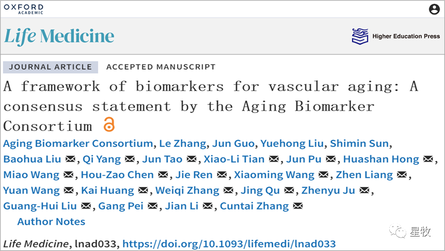 2023年7月,中國衰老標(biāo)志物研究聯(lián)合體(Aging Biomarker Consortium,ABC)發(fā)布《血管衰老標(biāo)志物專家共識(2023)》,該共識對與血管衰老相關(guān)的生物標(biāo)志物進(jìn)行了全面評估,并提出了一個系統(tǒng)框架,將生物標(biāo)志物分為三個維度:功能特征、結(jié)構(gòu)特征和體液標(biāo)志物。近日,該專家共識以“A framework of biomarkers for vascular aging: A consensus statement by the Aging Biomarker Consortium”為題發(fā)表于Life Medicine。