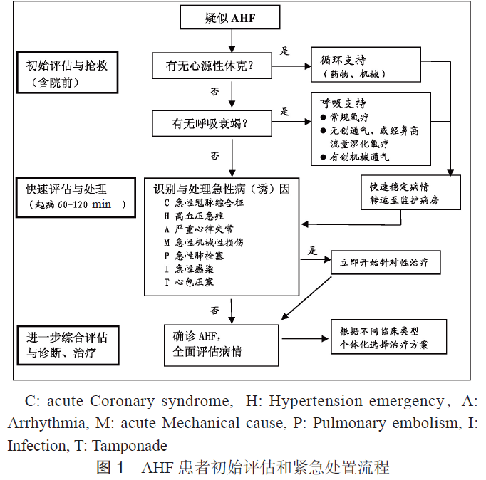 院前和急診科對于AHF患者的初始評估和緊急處理流程充分體現(xiàn)急診特有的「救命-治病」思維與臨床實踐,如圖1。