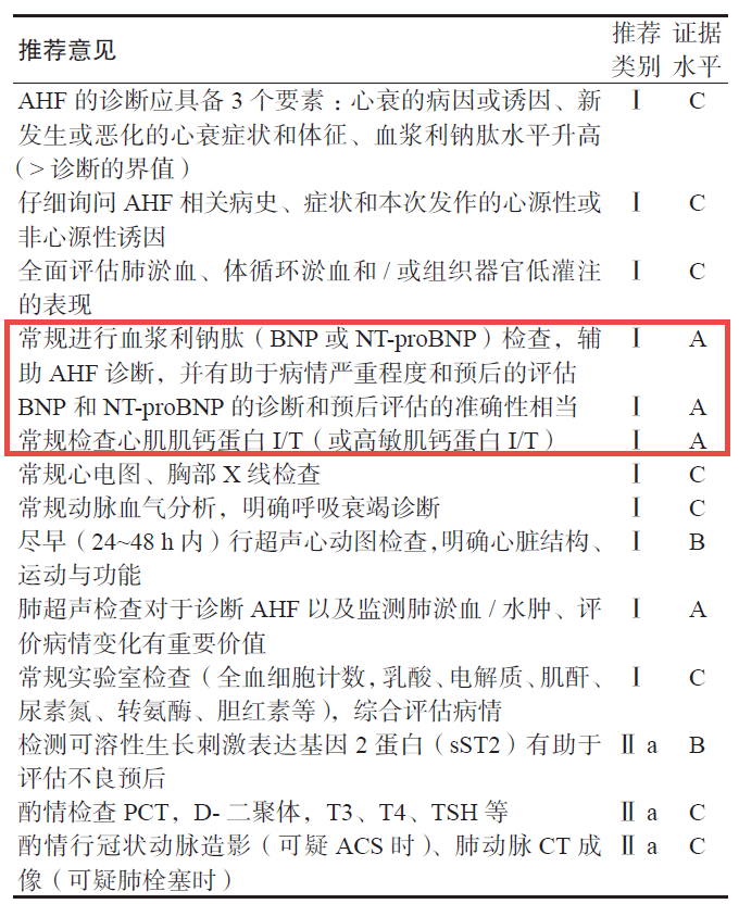 2、利鈉肽是AHF診斷的3個要素之一,所有疑似AHF的呼吸困難患者均應(yīng)進(jìn)行檢測利鈉肽(IA類推薦);NT-proBNP 需參考年齡因素、腎功能等因素影響。
