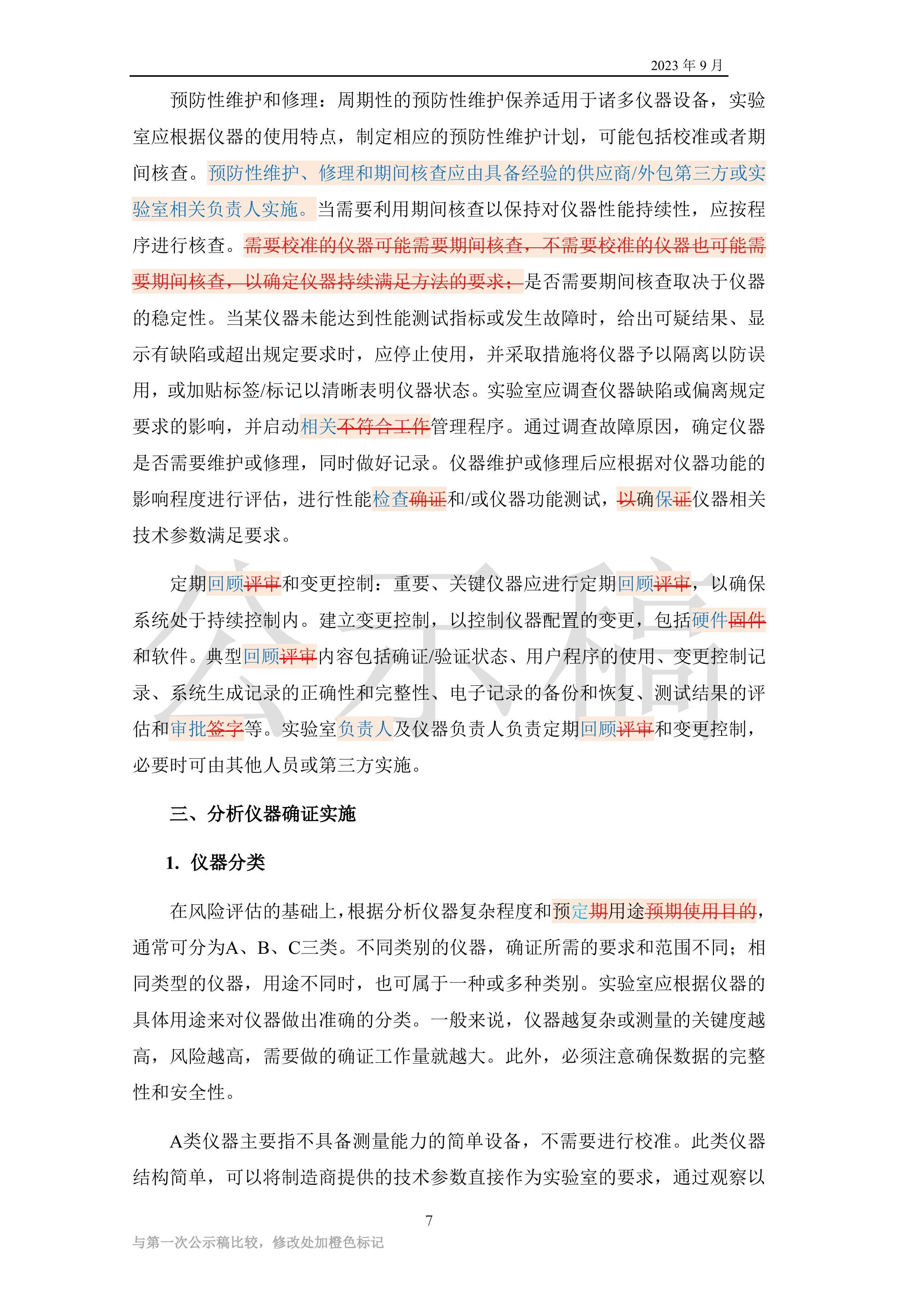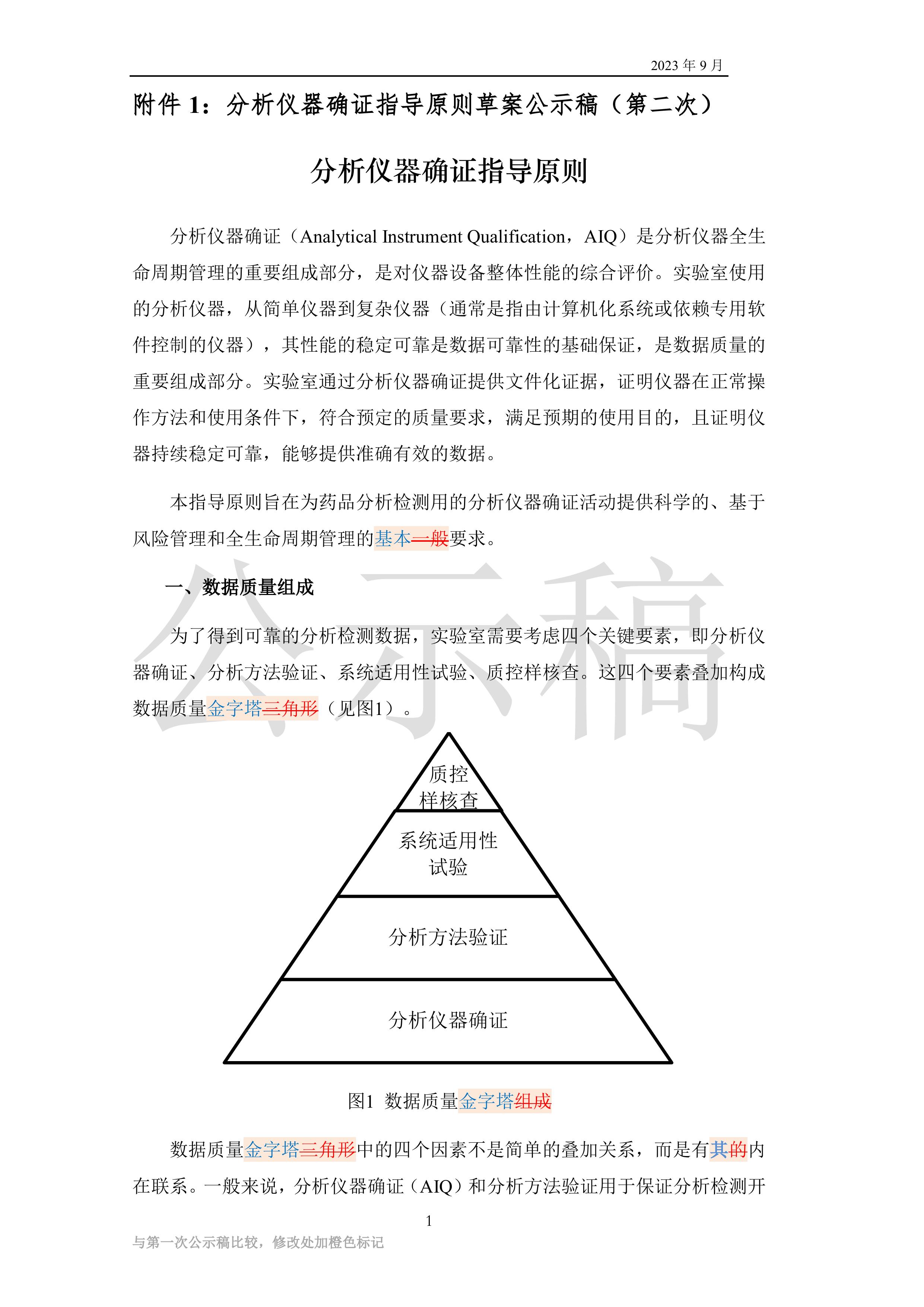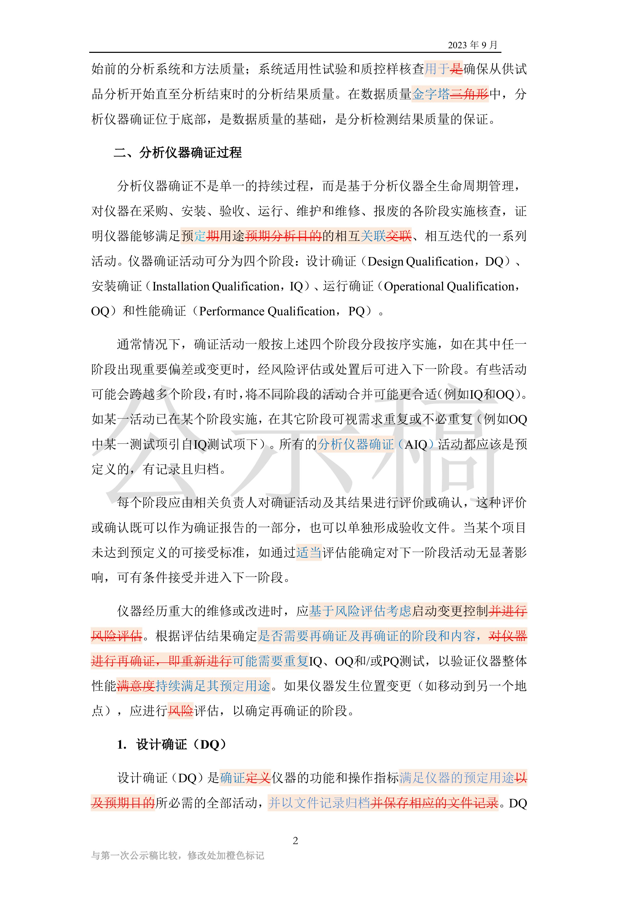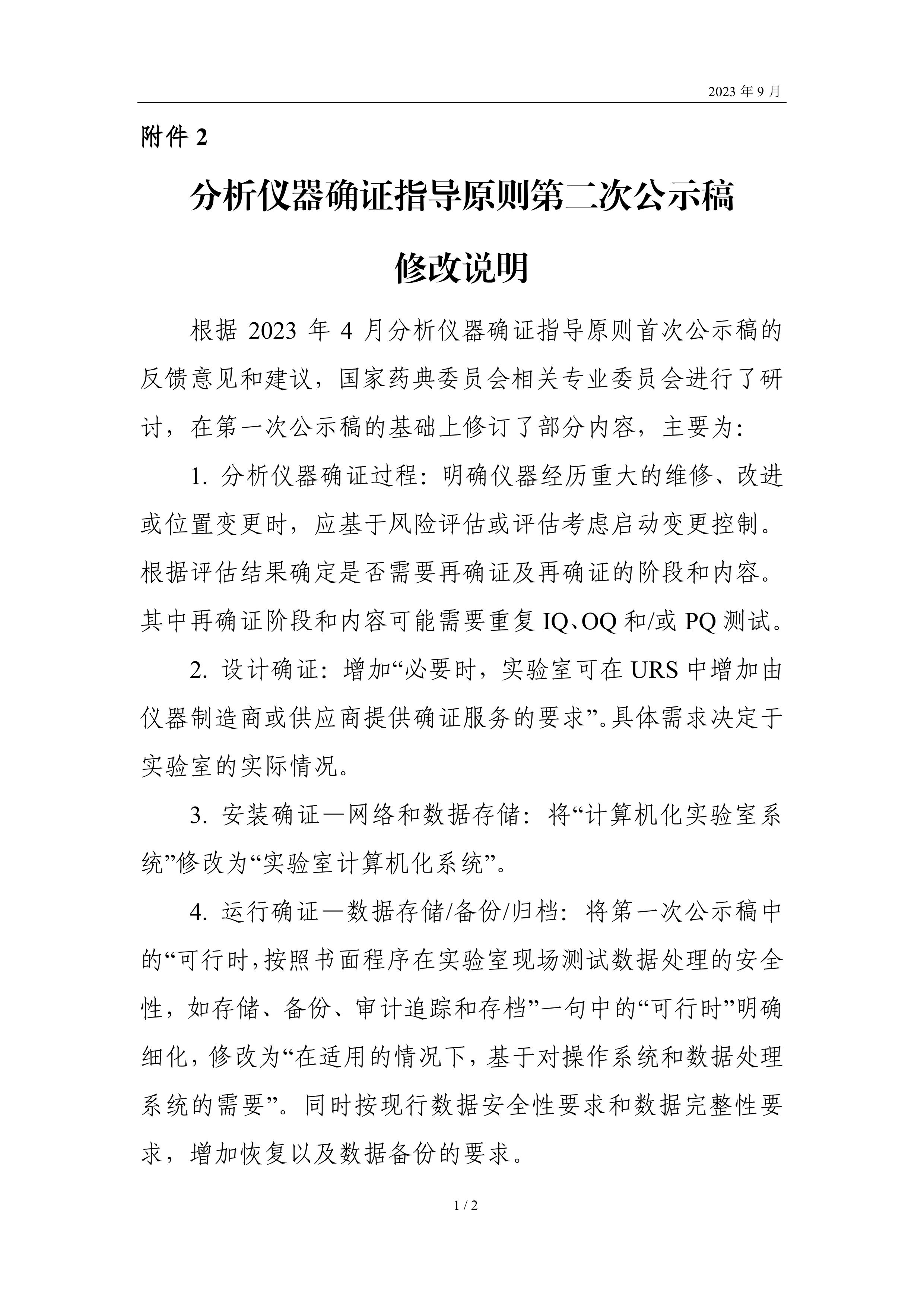 根據(jù)2023年4月分析儀器確證指導(dǎo)原則首次公示稿的反饋意見和建議,國(guó)家藥典委員會(huì)相關(guān)專業(yè)委員會(huì)進(jìn)行了研討,在第一次公示稿的基礎(chǔ)上修訂了部分內(nèi)容,主要為:1. 分析儀器確證過程:明確儀器經(jīng)歷重大的維修、改進(jìn) 或位置變更時(shí),應(yīng)基于風(fēng)險(xiǎn)評(píng)估或評(píng)估考慮啟動(dòng)變更控制。根據(jù)評(píng)估結(jié)果確定是否需要再確證及再確證的階段和內(nèi)容。其中再確證階段和內(nèi)容可能需要重復(fù) IQ、OQ 和/或 PQ 測(cè)試。2. 設(shè)計(jì)確證:增加“必要時(shí),實(shí)驗(yàn)室可在 URS 中增加由 儀器制造商或供應(yīng)商提供確證服務(wù)的要求”。具體需求決定于 實(shí)驗(yàn)室的實(shí)際情況。3. 安裝確證—網(wǎng)絡(luò)和數(shù)據(jù)存儲(chǔ):將“計(jì)算機(jī)化實(shí)驗(yàn)室系 統(tǒng)”修改為“實(shí)驗(yàn)室計(jì)算機(jī)化系統(tǒng)”。4. 運(yùn)行確證—數(shù)據(jù)存儲(chǔ)/備份/歸檔:將第一次公示稿中 的“可行時(shí),按照書面程序在實(shí)驗(yàn)室現(xiàn)場(chǎng)測(cè)試數(shù)據(jù)處理的安全 性,如存儲(chǔ)、備份、審計(jì)追蹤和存檔”一句中的“可行時(shí)”明確 細(xì)化,修改為“在適用的情況下,基于對(duì)操作系統(tǒng)和數(shù)據(jù)處理 系統(tǒng)的需要”。同時(shí)按現(xiàn)行數(shù)據(jù)安全性要求和數(shù)據(jù)完整性要 求,增加恢復(fù)以及數(shù)據(jù)備份的要求。5. 運(yùn)行確證—儀器功能測(cè)試:增加設(shè)計(jì)范圍,即“對(duì)大 型精密分析儀器(如后文的 C 類儀器),主要是確認(rèn)儀器在 不測(cè)試實(shí)際樣品,且在儀器設(shè)計(jì)的極限范圍內(nèi)或者是實(shí)驗(yàn)室 實(shí)際可能使用的極限范圍內(nèi)是否運(yùn)行良好,也就是最小限和 最大限試驗(yàn)的確認(rèn)”。6. 性能確證:將第一次公示稿中的“實(shí)驗(yàn)室必須制定 PQ 計(jì)劃,包括性能測(cè)試程序、驗(yàn)收標(biāo)準(zhǔn)和測(cè)試頻率,并且 應(yīng)建立預(yù)防性維護(hù)和修理、定期評(píng)審和變更控制的操作規(guī) 范”修改為“實(shí)驗(yàn)室制定 PQ 計(jì)劃,計(jì)劃包括性能測(cè)試程序、 驗(yàn)收標(biāo)準(zhǔn)和測(cè)試頻率,必要時(shí)建立日常使用、校驗(yàn)、預(yù)防性 維護(hù)和修理、定期回顧和變更控制的操作規(guī)范”。7. 統(tǒng)一全文名詞術(shù)語,規(guī)范文字表述。