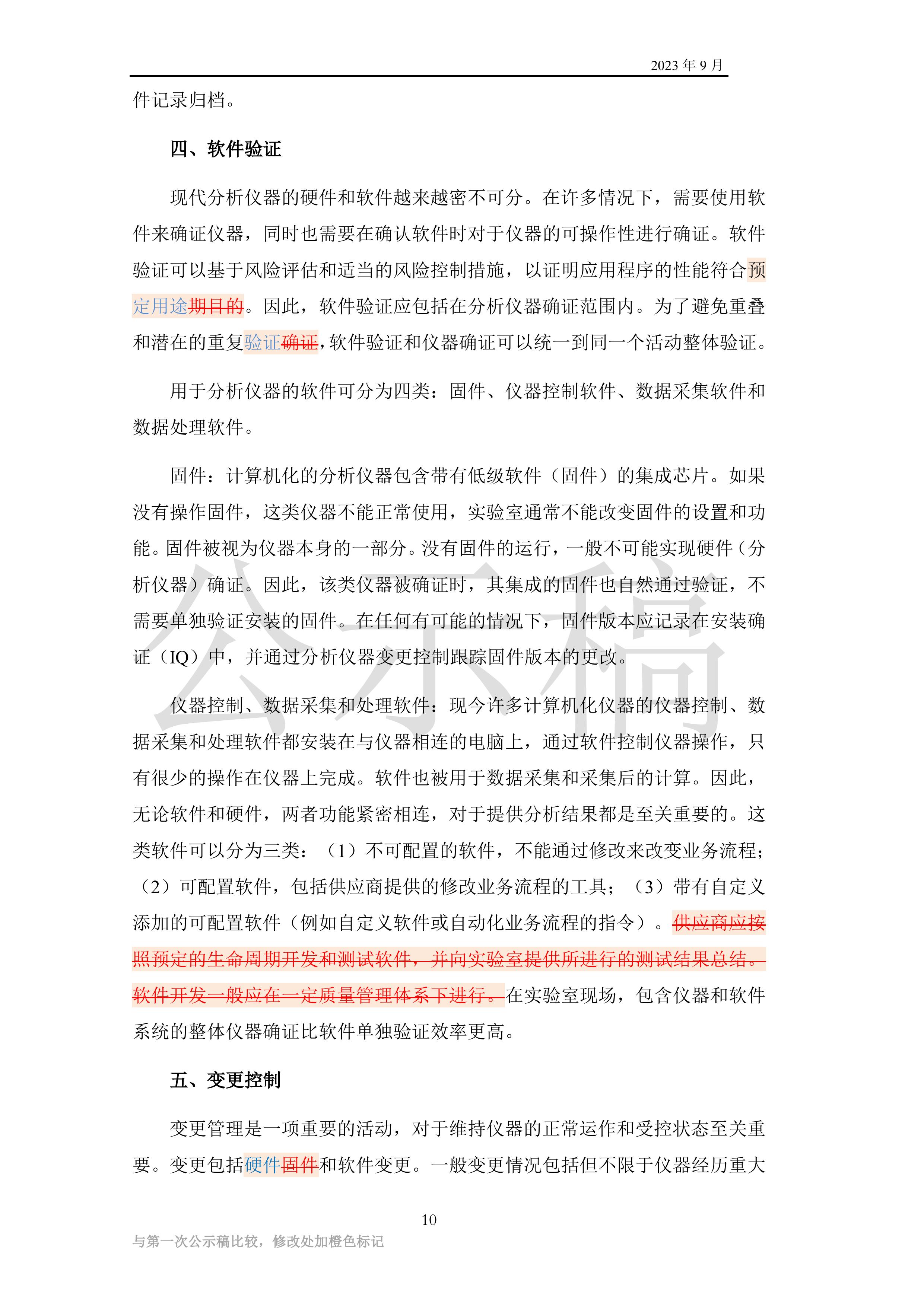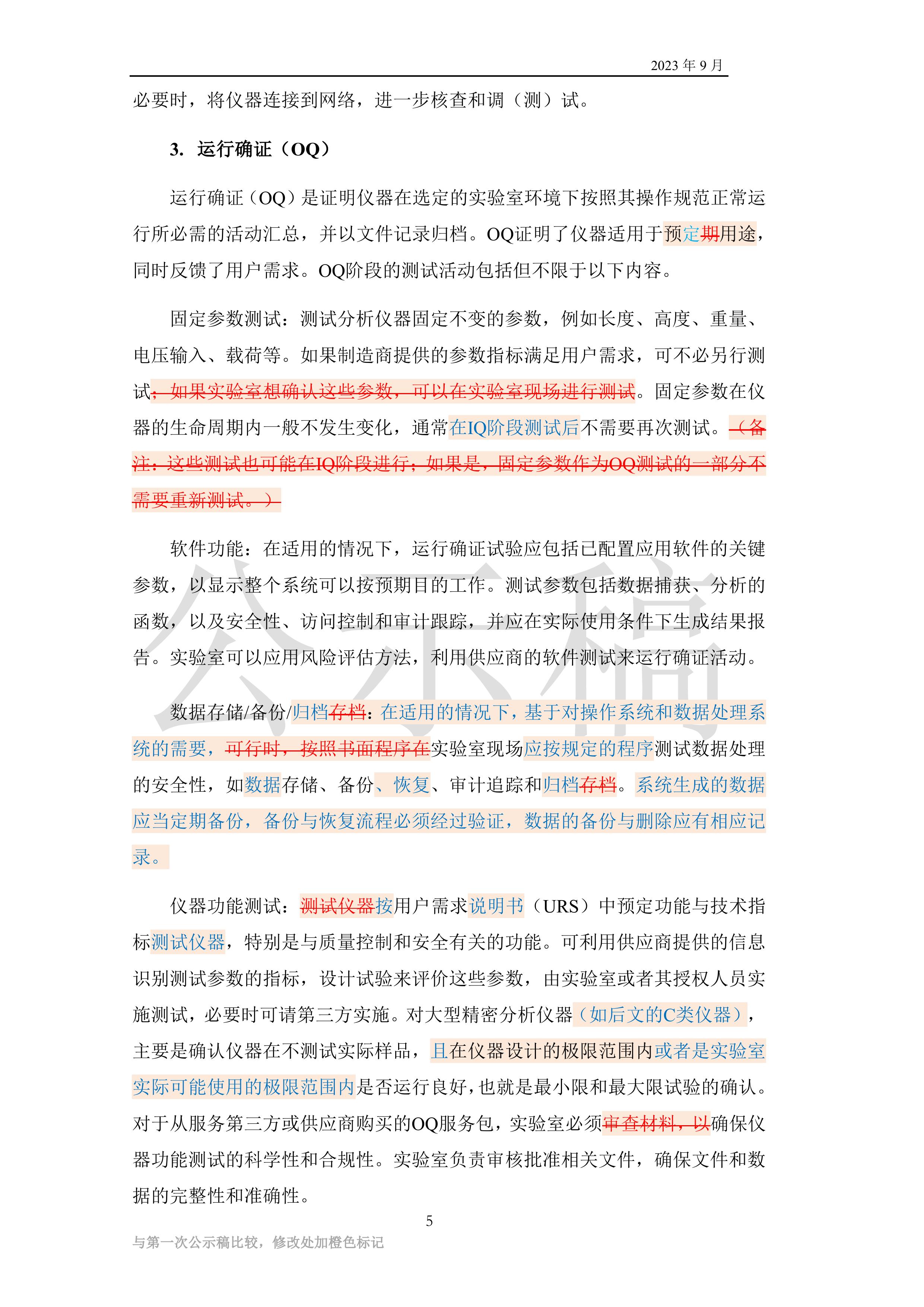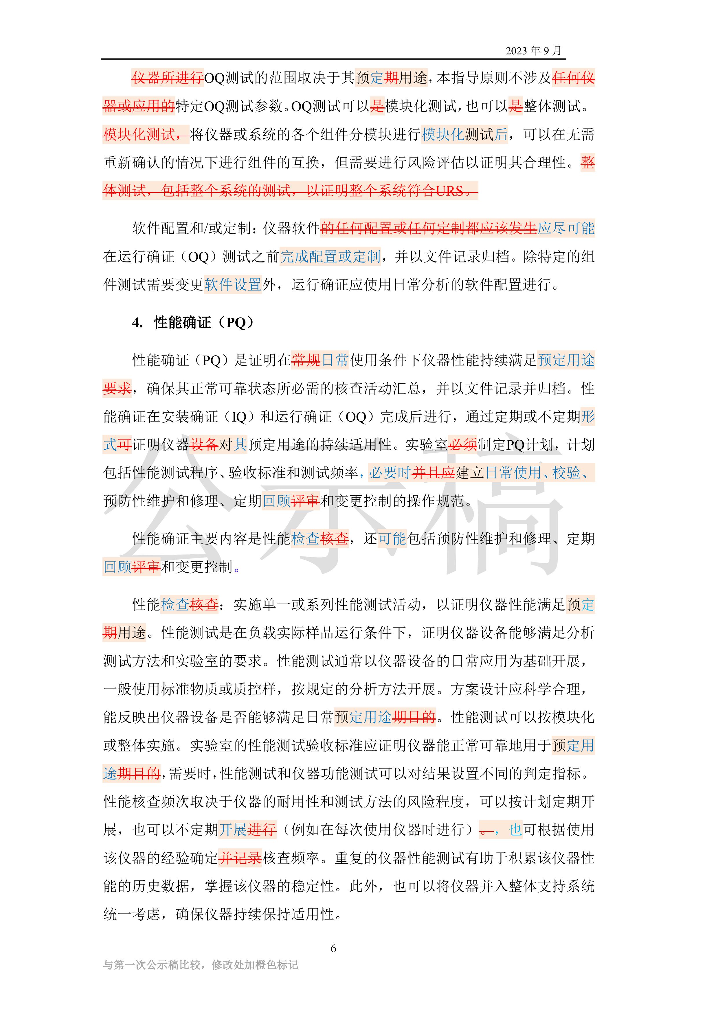 根據(jù)2023年4月分析儀器確證指導(dǎo)原則首次公示稿的反饋意見和建議,國(guó)家藥典委員會(huì)相關(guān)專業(yè)委員會(huì)進(jìn)行了研討,在第一次公示稿的基礎(chǔ)上修訂了部分內(nèi)容,主要為:1. 分析儀器確證過程:明確儀器經(jīng)歷重大的維修、改進(jìn) 或位置變更時(shí),應(yīng)基于風(fēng)險(xiǎn)評(píng)估或評(píng)估考慮啟動(dòng)變更控制。根據(jù)評(píng)估結(jié)果確定是否需要再確證及再確證的階段和內(nèi)容。其中再確證階段和內(nèi)容可能需要重復(fù) IQ、OQ 和/或 PQ 測(cè)試。2. 設(shè)計(jì)確證:增加“必要時(shí),實(shí)驗(yàn)室可在 URS 中增加由 儀器制造商或供應(yīng)商提供確證服務(wù)的要求”。具體需求決定于 實(shí)驗(yàn)室的實(shí)際情況。3. 安裝確證—網(wǎng)絡(luò)和數(shù)據(jù)存儲(chǔ):將“計(jì)算機(jī)化實(shí)驗(yàn)室系 統(tǒng)”修改為“實(shí)驗(yàn)室計(jì)算機(jī)化系統(tǒng)”。4. 運(yùn)行確證—數(shù)據(jù)存儲(chǔ)/備份/歸檔:將第一次公示稿中 的“可行時(shí),按照書面程序在實(shí)驗(yàn)室現(xiàn)場(chǎng)測(cè)試數(shù)據(jù)處理的安全 性,如存儲(chǔ)、備份、審計(jì)追蹤和存檔”一句中的“可行時(shí)”明確 細(xì)化,修改為“在適用的情況下,基于對(duì)操作系統(tǒng)和數(shù)據(jù)處理 系統(tǒng)的需要”。同時(shí)按現(xiàn)行數(shù)據(jù)安全性要求和數(shù)據(jù)完整性要 求,增加恢復(fù)以及數(shù)據(jù)備份的要求。5. 運(yùn)行確證—儀器功能測(cè)試:增加設(shè)計(jì)范圍,即“對(duì)大 型精密分析儀器(如后文的 C 類儀器),主要是確認(rèn)儀器在 不測(cè)試實(shí)際樣品,且在儀器設(shè)計(jì)的極限范圍內(nèi)或者是實(shí)驗(yàn)室 實(shí)際可能使用的極限范圍內(nèi)是否運(yùn)行良好,也就是最小限和 最大限試驗(yàn)的確認(rèn)”。6. 性能確證:將第一次公示稿中的“實(shí)驗(yàn)室必須制定 PQ 計(jì)劃,包括性能測(cè)試程序、驗(yàn)收標(biāo)準(zhǔn)和測(cè)試頻率,并且 應(yīng)建立預(yù)防性維護(hù)和修理、定期評(píng)審和變更控制的操作規(guī) 范”修改為“實(shí)驗(yàn)室制定 PQ 計(jì)劃,計(jì)劃包括性能測(cè)試程序、 驗(yàn)收標(biāo)準(zhǔn)和測(cè)試頻率,必要時(shí)建立日常使用、校驗(yàn)、預(yù)防性 維護(hù)和修理、定期回顧和變更控制的操作規(guī)范”。7. 統(tǒng)一全文名詞術(shù)語,規(guī)范文字表述。