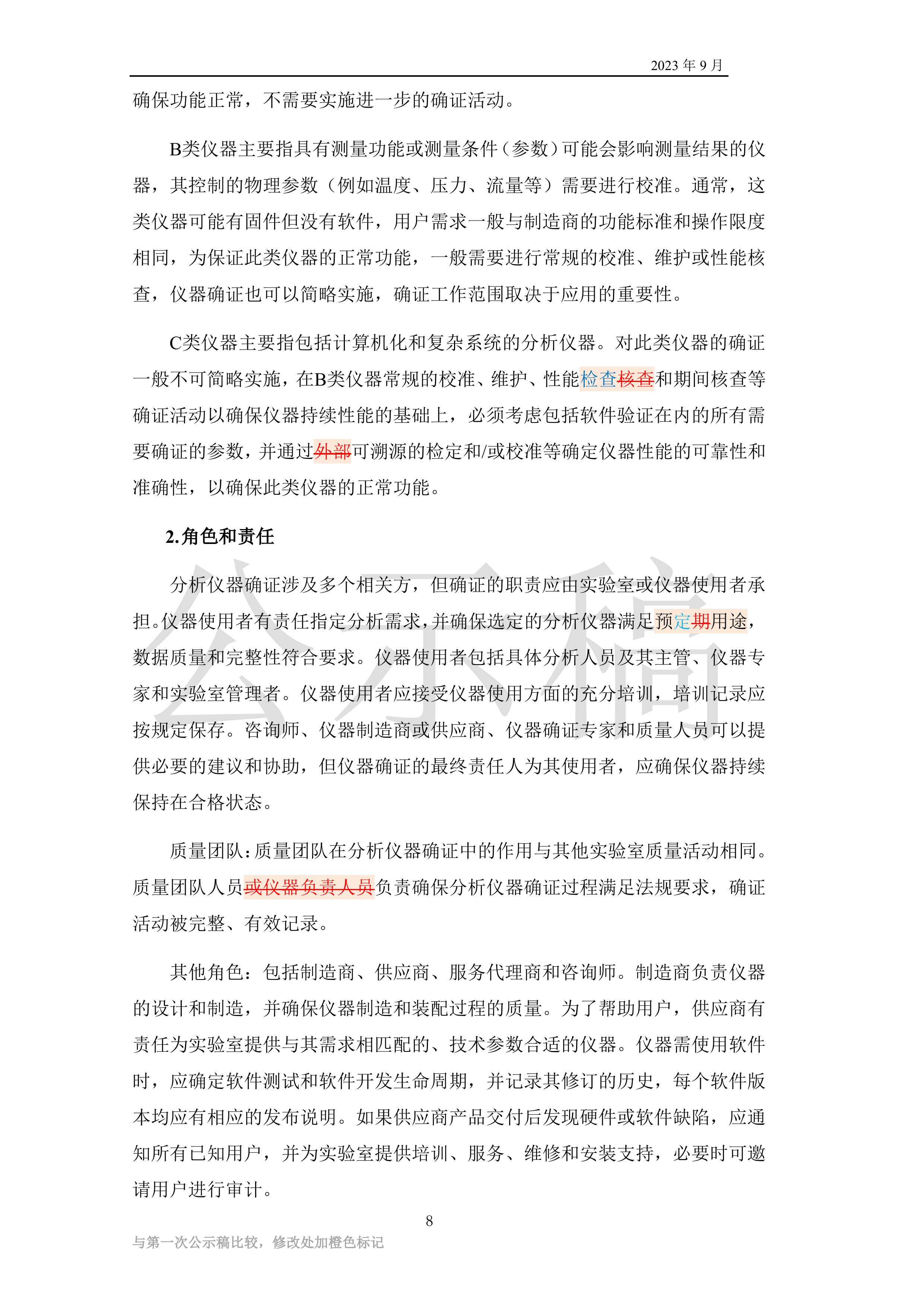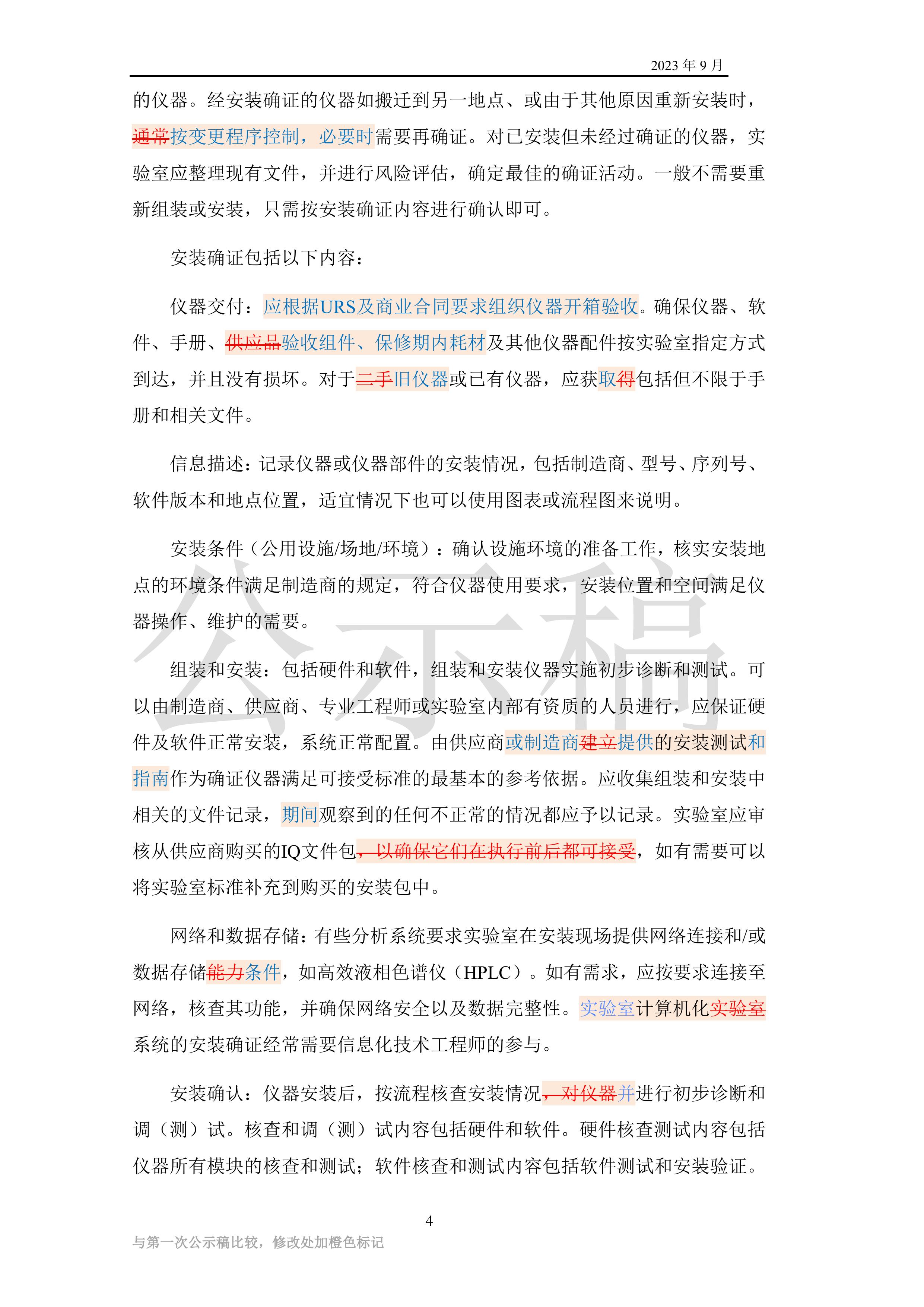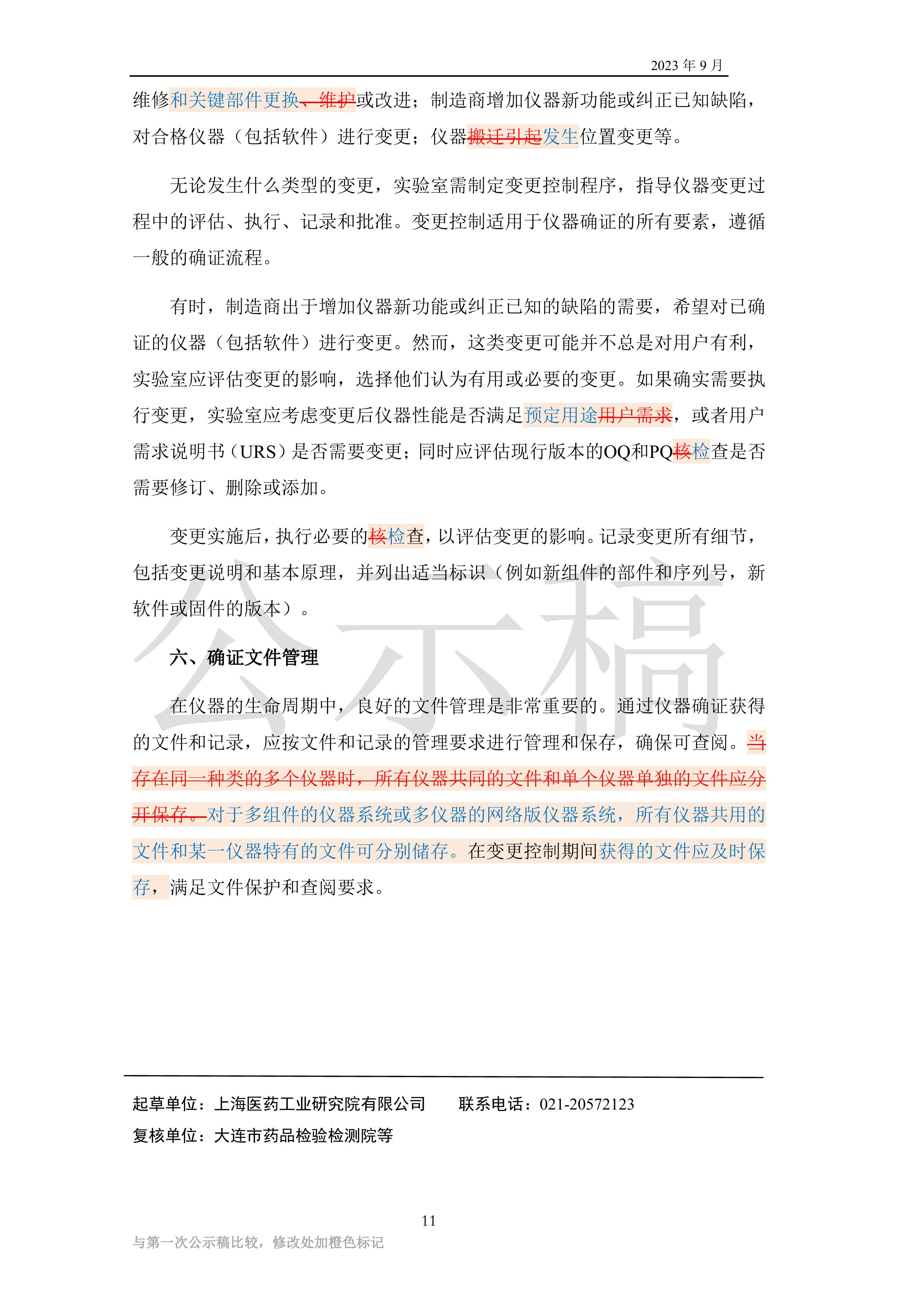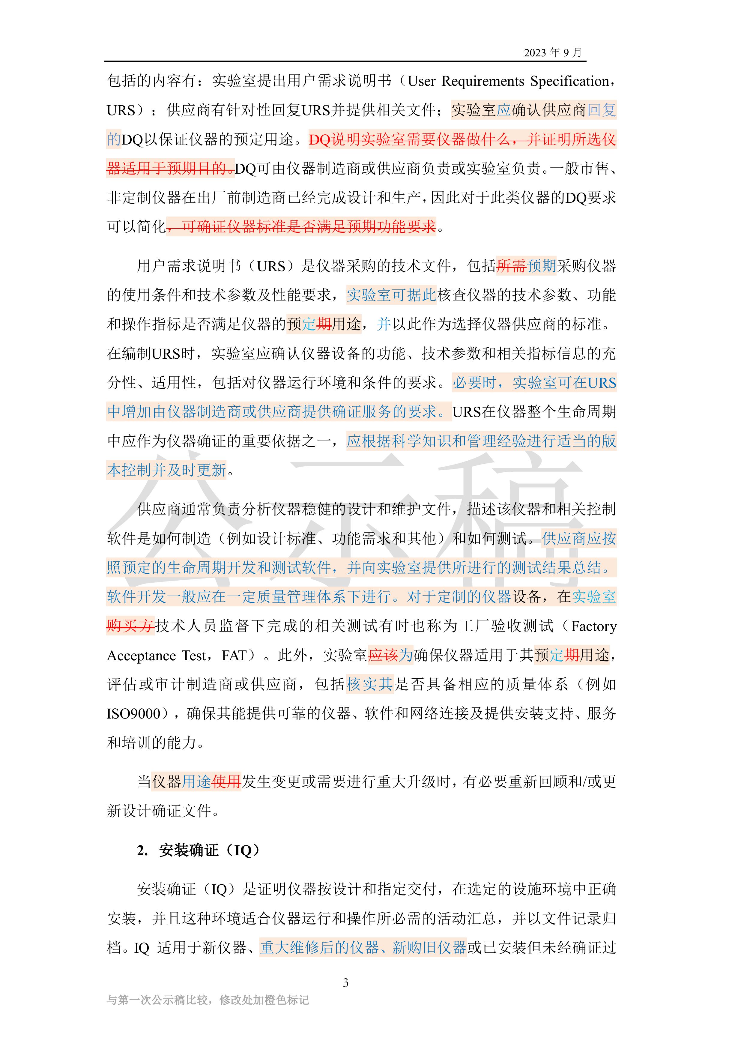 根據(jù)2023年4月分析儀器確證指導(dǎo)原則首次公示稿的反饋意見和建議,國(guó)家藥典委員會(huì)相關(guān)專業(yè)委員會(huì)進(jìn)行了研討,在第一次公示稿的基礎(chǔ)上修訂了部分內(nèi)容,主要為:1. 分析儀器確證過程:明確儀器經(jīng)歷重大的維修、改進(jìn) 或位置變更時(shí),應(yīng)基于風(fēng)險(xiǎn)評(píng)估或評(píng)估考慮啟動(dòng)變更控制。根據(jù)評(píng)估結(jié)果確定是否需要再確證及再確證的階段和內(nèi)容。其中再確證階段和內(nèi)容可能需要重復(fù) IQ、OQ 和/或 PQ 測(cè)試。2. 設(shè)計(jì)確證:增加“必要時(shí),實(shí)驗(yàn)室可在 URS 中增加由 儀器制造商或供應(yīng)商提供確證服務(wù)的要求”。具體需求決定于 實(shí)驗(yàn)室的實(shí)際情況。3. 安裝確證—網(wǎng)絡(luò)和數(shù)據(jù)存儲(chǔ):將“計(jì)算機(jī)化實(shí)驗(yàn)室系 統(tǒng)”修改為“實(shí)驗(yàn)室計(jì)算機(jī)化系統(tǒng)”。4. 運(yùn)行確證—數(shù)據(jù)存儲(chǔ)/備份/歸檔:將第一次公示稿中 的“可行時(shí),按照書面程序在實(shí)驗(yàn)室現(xiàn)場(chǎng)測(cè)試數(shù)據(jù)處理的安全 性,如存儲(chǔ)、備份、審計(jì)追蹤和存檔”一句中的“可行時(shí)”明確 細(xì)化,修改為“在適用的情況下,基于對(duì)操作系統(tǒng)和數(shù)據(jù)處理 系統(tǒng)的需要”。同時(shí)按現(xiàn)行數(shù)據(jù)安全性要求和數(shù)據(jù)完整性要 求,增加恢復(fù)以及數(shù)據(jù)備份的要求。5. 運(yùn)行確證—儀器功能測(cè)試:增加設(shè)計(jì)范圍,即“對(duì)大 型精密分析儀器(如后文的 C 類儀器),主要是確認(rèn)儀器在 不測(cè)試實(shí)際樣品,且在儀器設(shè)計(jì)的極限范圍內(nèi)或者是實(shí)驗(yàn)室 實(shí)際可能使用的極限范圍內(nèi)是否運(yùn)行良好,也就是最小限和 最大限試驗(yàn)的確認(rèn)”。6. 性能確證:將第一次公示稿中的“實(shí)驗(yàn)室必須制定 PQ 計(jì)劃,包括性能測(cè)試程序、驗(yàn)收標(biāo)準(zhǔn)和測(cè)試頻率,并且 應(yīng)建立預(yù)防性維護(hù)和修理、定期評(píng)審和變更控制的操作規(guī) 范”修改為“實(shí)驗(yàn)室制定 PQ 計(jì)劃,計(jì)劃包括性能測(cè)試程序、 驗(yàn)收標(biāo)準(zhǔn)和測(cè)試頻率,必要時(shí)建立日常使用、校驗(yàn)、預(yù)防性 維護(hù)和修理、定期回顧和變更控制的操作規(guī)范”。7. 統(tǒng)一全文名詞術(shù)語,規(guī)范文字表述。