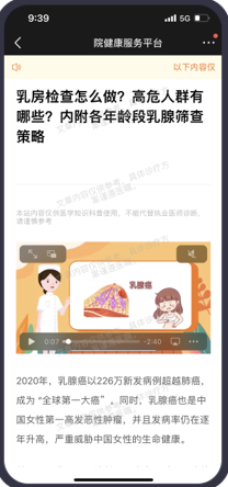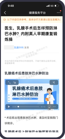 “在乳腺外科,主要面對(duì)的疾病就是乳腺結(jié)節(jié)和乳腺癌。女性患者在面對(duì)這些疾病時(shí),大多會(huì)感到焦慮;酆茫闶茿I陪檢概念的引入,通過(guò)智能化的方式為患者提供便利。在患者未到醫(yī)院前,通過(guò)推送乳腺自查的科普文章進(jìn)行健康宣教。如果發(fā)現(xiàn)有任何異常,可以直接在文章中掛號(hào),相比傳統(tǒng)醫(yī)院預(yù)約掛號(hào)的繁瑣流程,步驟大大簡(jiǎn)化。只需點(diǎn)擊通知并打開(kāi)文章,下面就是掛號(hào)環(huán)節(jié),操作方便、快捷;颊叩皆和瓿蓹z查系統(tǒng)會(huì)提供報(bào)告解讀服務(wù),不再需要自己上網(wǎng)搜索,還會(huì)直接推送報(bào)告的相關(guān)解讀以及乳房疾病的科普知識(shí)。此外,還會(huì)推送科室介紹,讓患者了解我們有一流的醫(yī)生和技術(shù),能夠?yàn)槠涮峁┯行У脑\療。在患者住院、出院以及后續(xù)治療過(guò)程中,我們都會(huì)提供相應(yīng)的服務(wù)支持,幫助她們更好地恢復(fù)健康。在整個(gè)過(guò)程中,我們致力于為患者提供全方位的服務(wù)支持,幫助科室更好地運(yùn)營(yíng)管理!