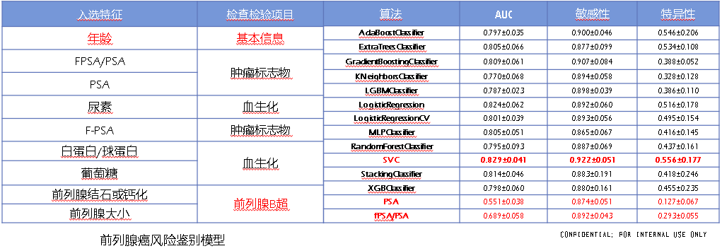 “我們做了一個(gè)前列腺癌的分析模型。前列腺癌的PSA值大于4被認(rèn)為是陽(yáng)性,前列腺炎、前列腺增生、前列腺鈣化、前列腺癌都可以引發(fā)這個(gè)PSA的升高。只依靠PSA判定前列腺癌,AUC是55%;通過(guò)綜合檢驗(yàn)?zāi)P停罱KAUC可以達(dá)到83%,極大的提高了鑒別前列腺癌的準(zhǔn)確率!