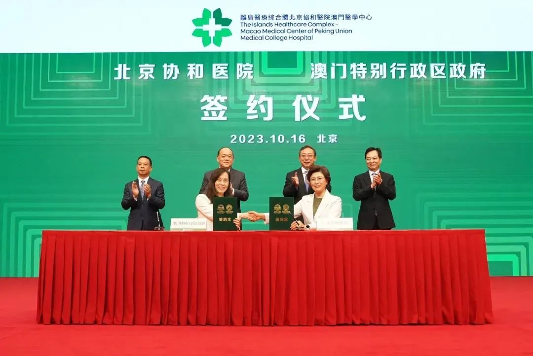 2023年10月16日,在澳門特別行政區(qū)行政長官賀一誠,國家衛(wèi)生健康委副主任曹雪濤,澳門中聯(lián)辦副主任黃柳權(quán),北京協(xié)和醫(yī)院名譽院長、離島醫(yī)療綜合體北京協(xié)和醫(yī)院澳門醫(yī)學(xué)中心策略發(fā)展委員會主席趙玉沛共同見證下,北京協(xié)和醫(yī)院院長張抒揚與澳門特別行政區(qū)政府社會文化司司長歐陽瑜簽署《離島醫(yī)療綜合體北京協(xié)和醫(yī)院澳門醫(yī)學(xué)中心運營合作協(xié)議》。簽署儀式由北京協(xié)和醫(yī)院黨委書記吳沛新主持。