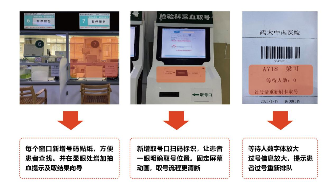 醫(yī)學(xué)檢驗科開展門急診采血精益化管理項目:優(yōu)化取號機位置便于患者找尋;調(diào)整取號單內(nèi)容布局,突出重點信息;窗口可視化改善,新增提示信息,方便快速識別。