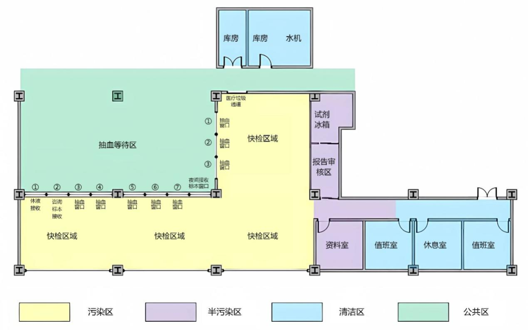 醫(yī)學(xué)檢驗科應(yīng)堅持分區(qū)、分流、延展和儲存的原則進行門急診實驗室改造。中南醫(yī)院醫(yī)學(xué)檢驗科在舊房改造時借助內(nèi)部走廊空間擴大了候診區(qū),同時增加采血窗口及備份窗口,若采血排隊人數(shù)超過一定人數(shù)時則增加替補窗口,確;颊叩却裳獣r間不超過15min;通過大的箭頭標(biāo)識分隔排隊和取報告人群,調(diào)整取報告區(qū)域。明確實驗室內(nèi)部分區(qū),實現(xiàn)三區(qū)三流,制定人員操作的最優(yōu)路徑。