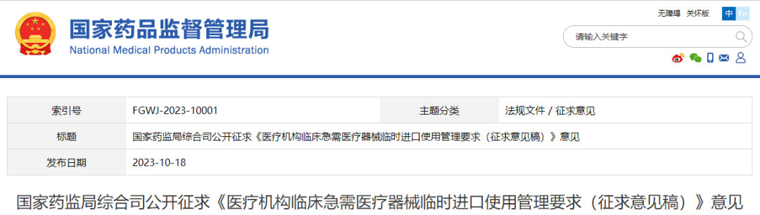 為做好《醫(yī)療器械監(jiān)督管理?xiàng)l例》配套文件修訂工作,國(guó)家藥監(jiān)局起草了《醫(yī)療機(jī)構(gòu)臨床急需醫(yī)療器械臨時(shí)進(jìn)口使用管理要求(征求意見稿)》等文件,現(xiàn)向社會(huì)公開征求意見。請(qǐng)于2023年11月15日前,將有關(guān)意見通過電子郵件方式反饋至ylqxzc@nmpa.gov.cn,郵件標(biāo)題注明“急需進(jìn)口使用意見”。