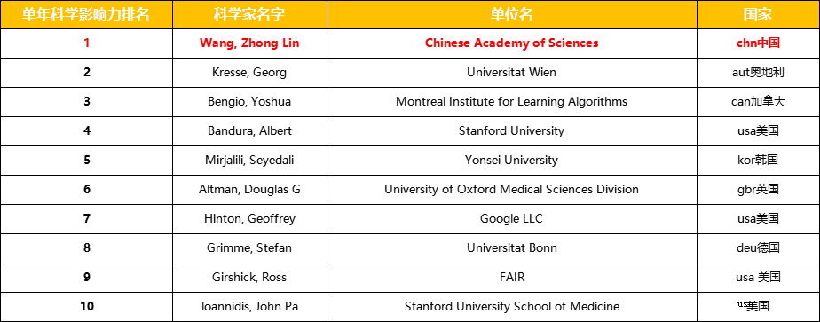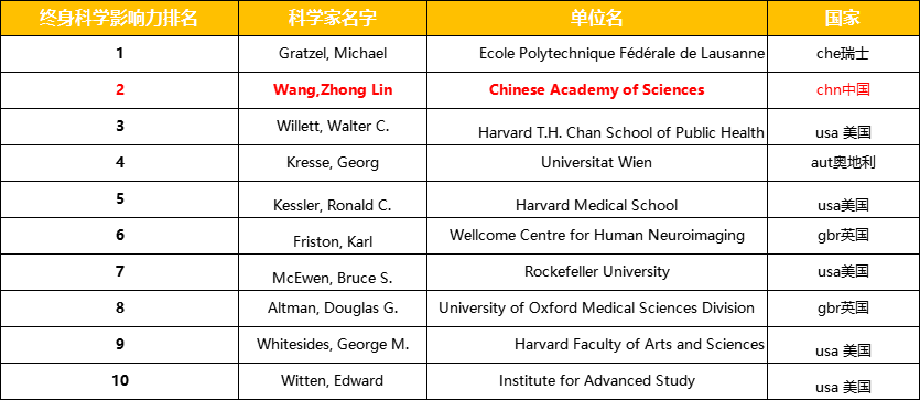 值得一提的是,根據(jù)最新數(shù)據(jù),中國科學(xué)院的學(xué)者王中林院士再次名列前茅:全學(xué)科職業(yè)生涯科學(xué)影響力(Career-long impact)排名第2;而全學(xué)科單年度科學(xué)影響力(Single-year impact)排名則連續(xù)4年蟬聯(lián)榜首,自2020年始保持這一位置。