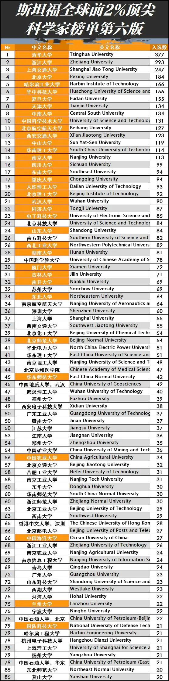 國內(nèi)高校入選斯坦福大學(xué)全球前2%頂尖科學(xué)家榜單的排名完整榜單如下: