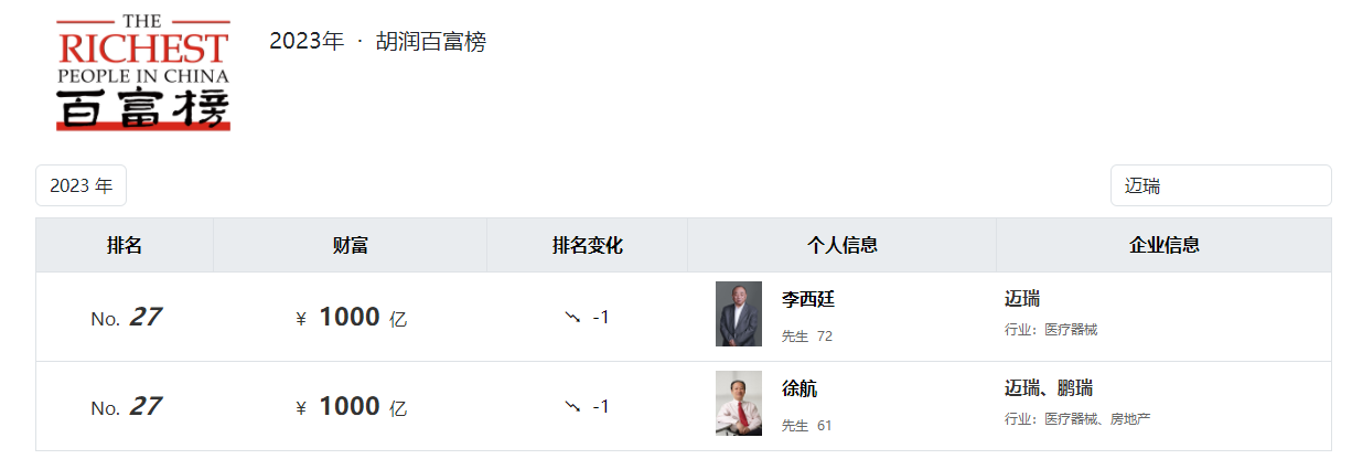 除了鐘睒睒,此次《2023年胡潤(rùn)百富榜》,在前100名當(dāng)中,邁瑞醫(yī)療的徐航以及李西廷均以1000億元的財(cái)富排名第27位。