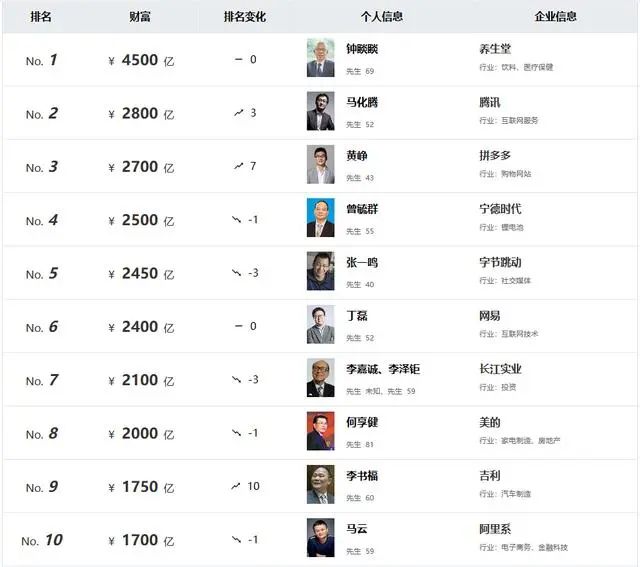 去年位列二、三名的字節(jié)跳動(dòng)張一鳴和寧德時(shí)代曾毓群財(cái)富排名均下降,分別位列第五、四位。