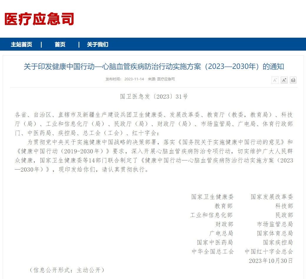 11月14日,國(guó)家衛(wèi)健委醫(yī)療應(yīng)急司發(fā)布了《關(guān)于印發(fā)健康中國(guó)行動(dòng)—心腦血管疾病防治行動(dòng)實(shí)施方案(2023—2030年)的通知》。
