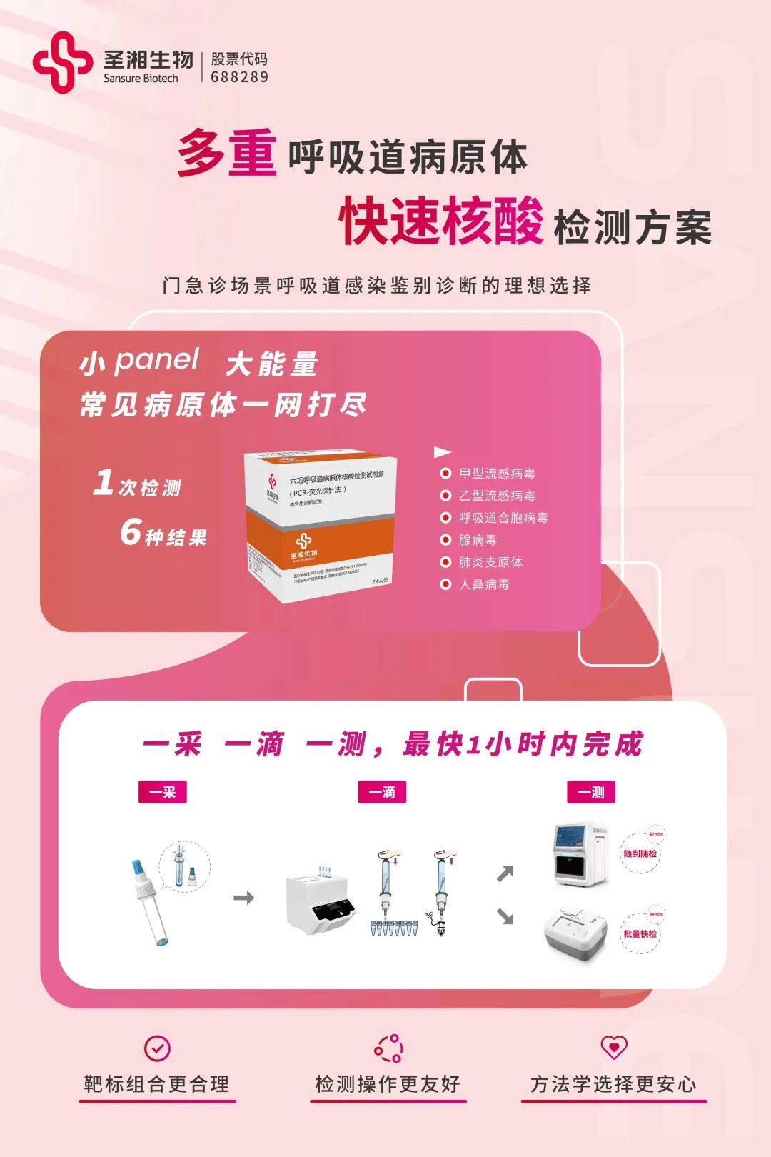 圣湘生物六項(xiàng)呼吸道病原體核酸檢測試劑盒(PCR-熒光探針法),可同時檢測甲型流感病毒(核酸)、乙型流感病毒(核酸)、呼吸道合胞病毒(核酸)、腺病毒(核酸)、鼻病毒(核酸)和肺炎支原體(核酸)6個靶標(biāo),是目前唯一滿足每日陽性上報的六項(xiàng)呼吸道核酸檢測試劑,同時試劑不僅可以兼容開放新冠PCR設(shè)備,還可以依托于圣湘呼吸道全新快速核酸檢測技術(shù)最快可以1小時報告六項(xiàng)病原,滿足門診(含發(fā)熱門診)、急診、住院部患者快速診斷需求和每日呼吸道感染性疾病診療情況上報需求。
