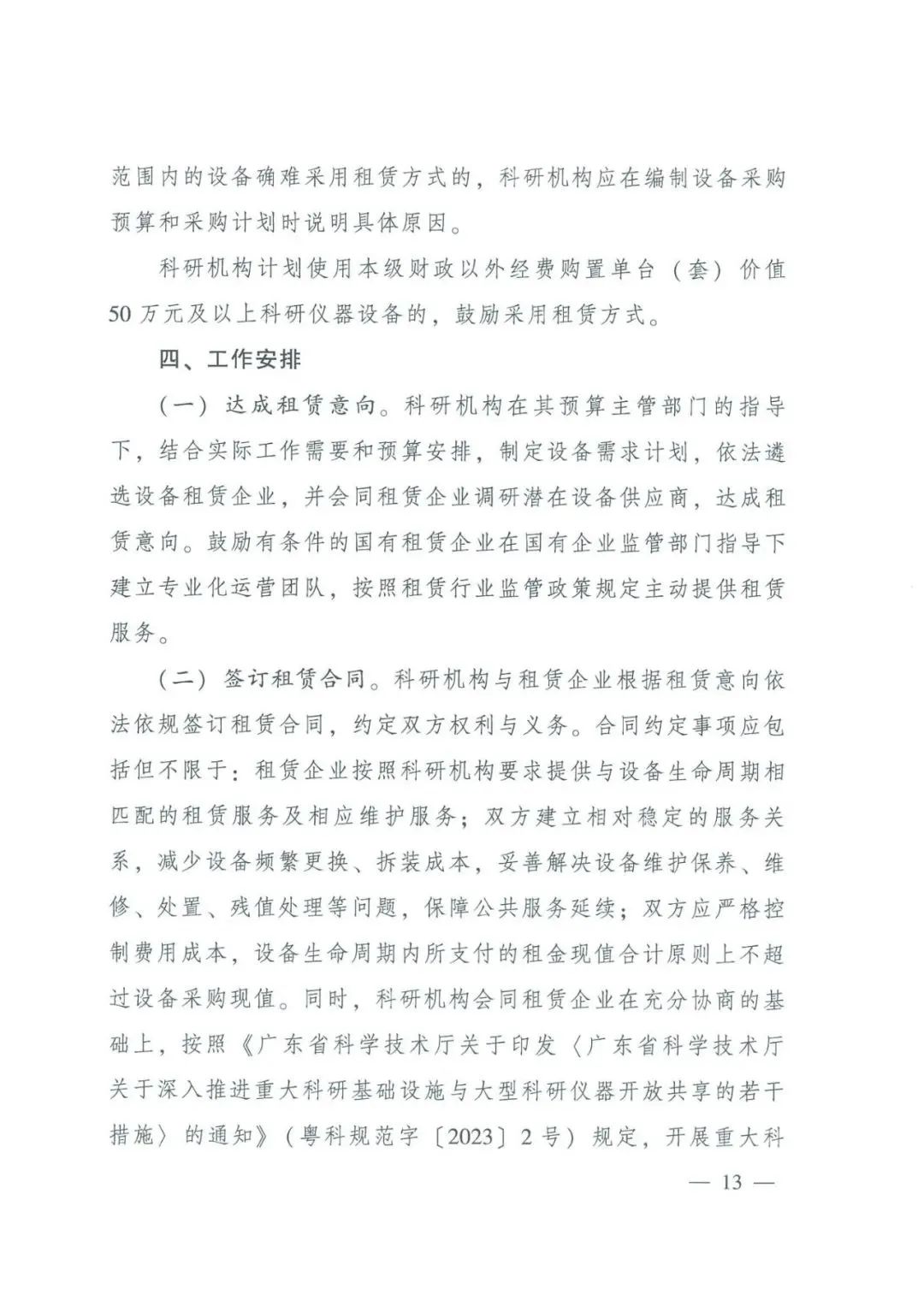 2)科技領(lǐng)域:科研機(jī)構(gòu)計(jì)劃使用本級(jí)財(cái)政以外經(jīng)費(fèi)購(gòu)置單臺(tái) (套) 價(jià)值50萬(wàn)元及以上科研儀器設(shè)備的,鼓勵(lì)采用租賃方式。