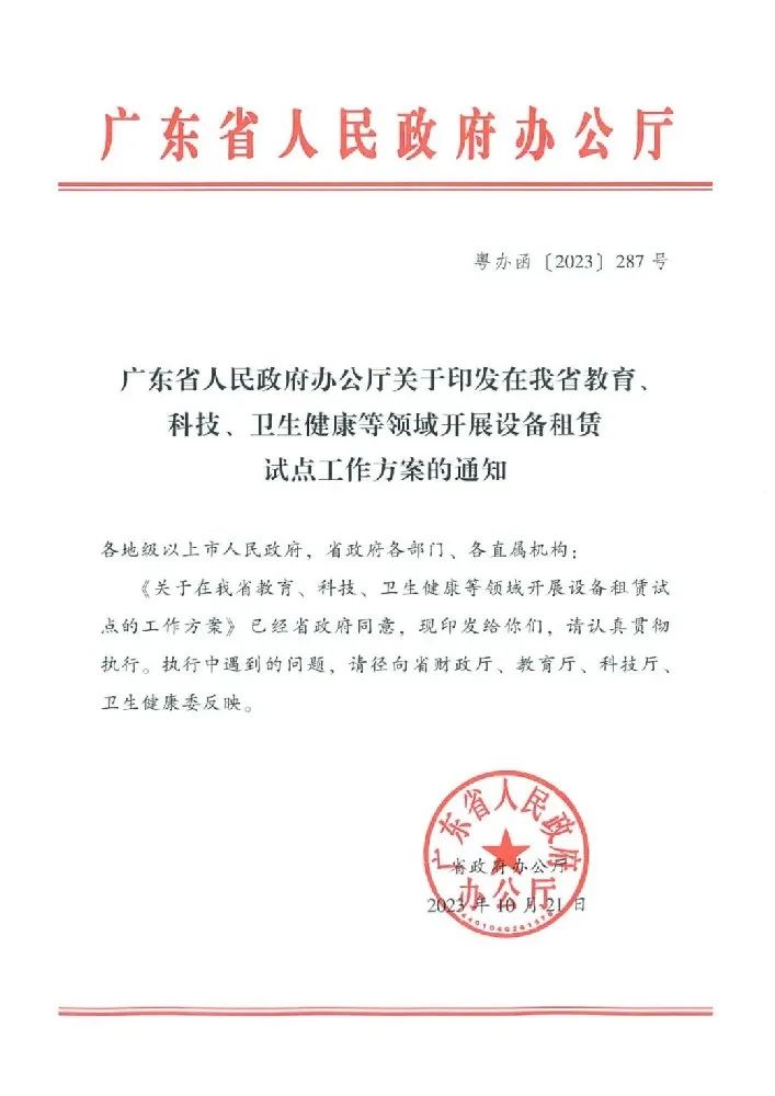 近日,廣東省人民政府辦公廳發(fā)布《廣東省人民政府辦公廳關(guān)于印發(fā)在我省教育、科技、衛(wèi)生健康等領(lǐng)域開展設(shè)備租賃試點(diǎn)工作方案的通知》。