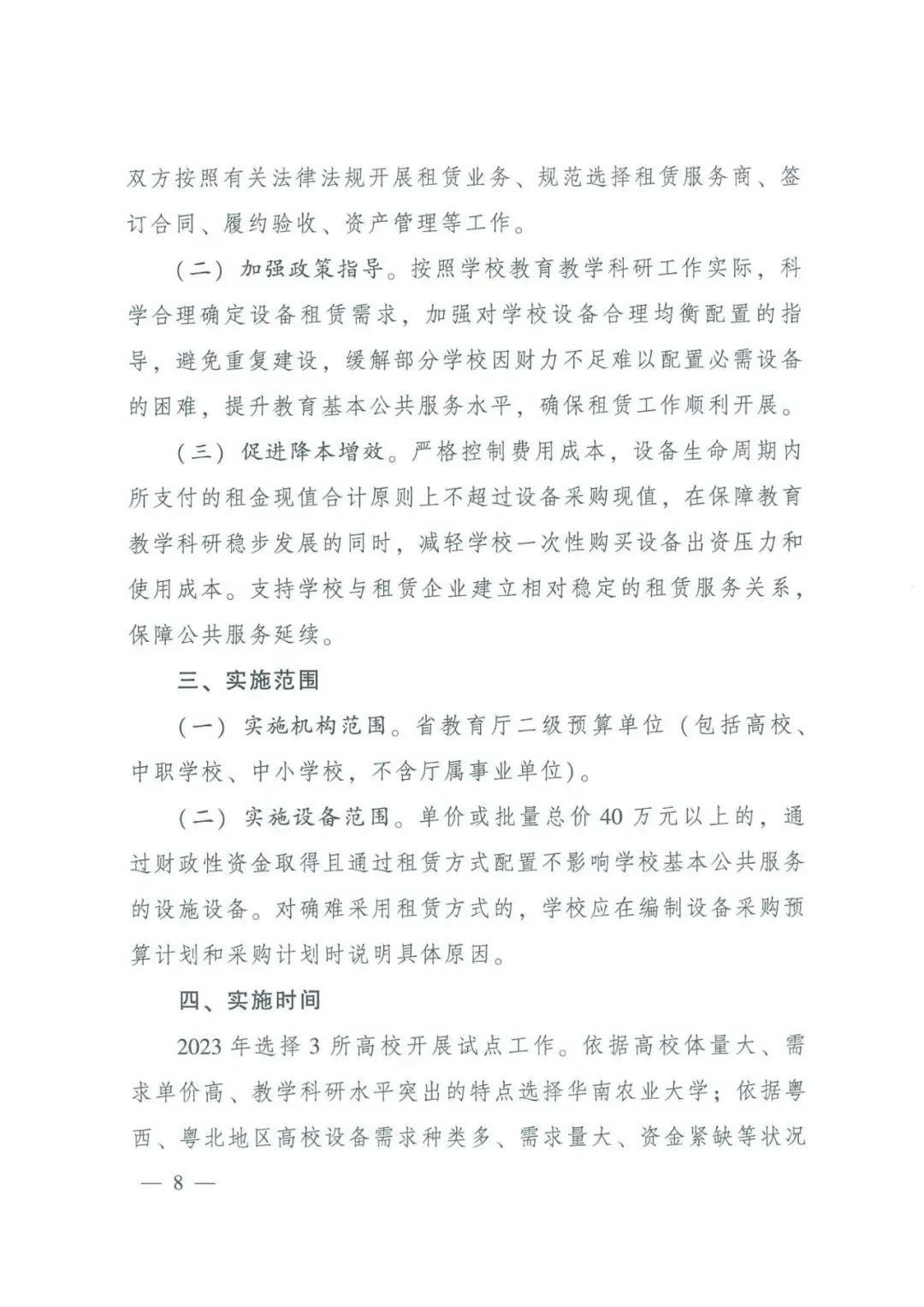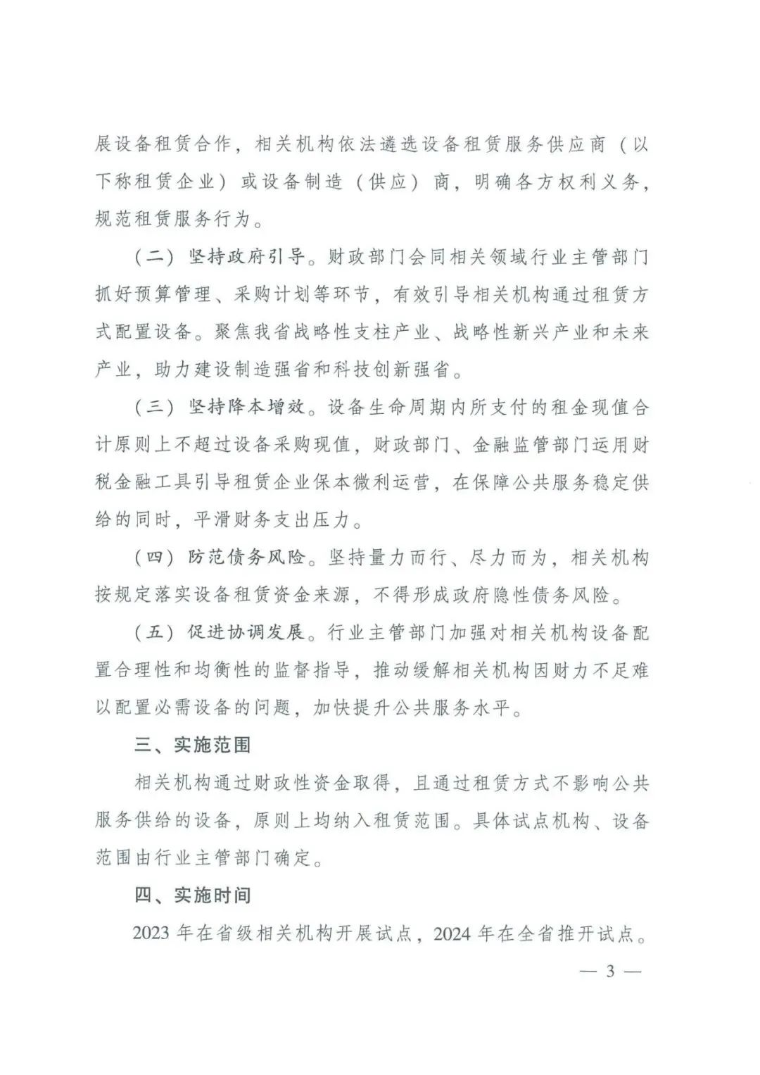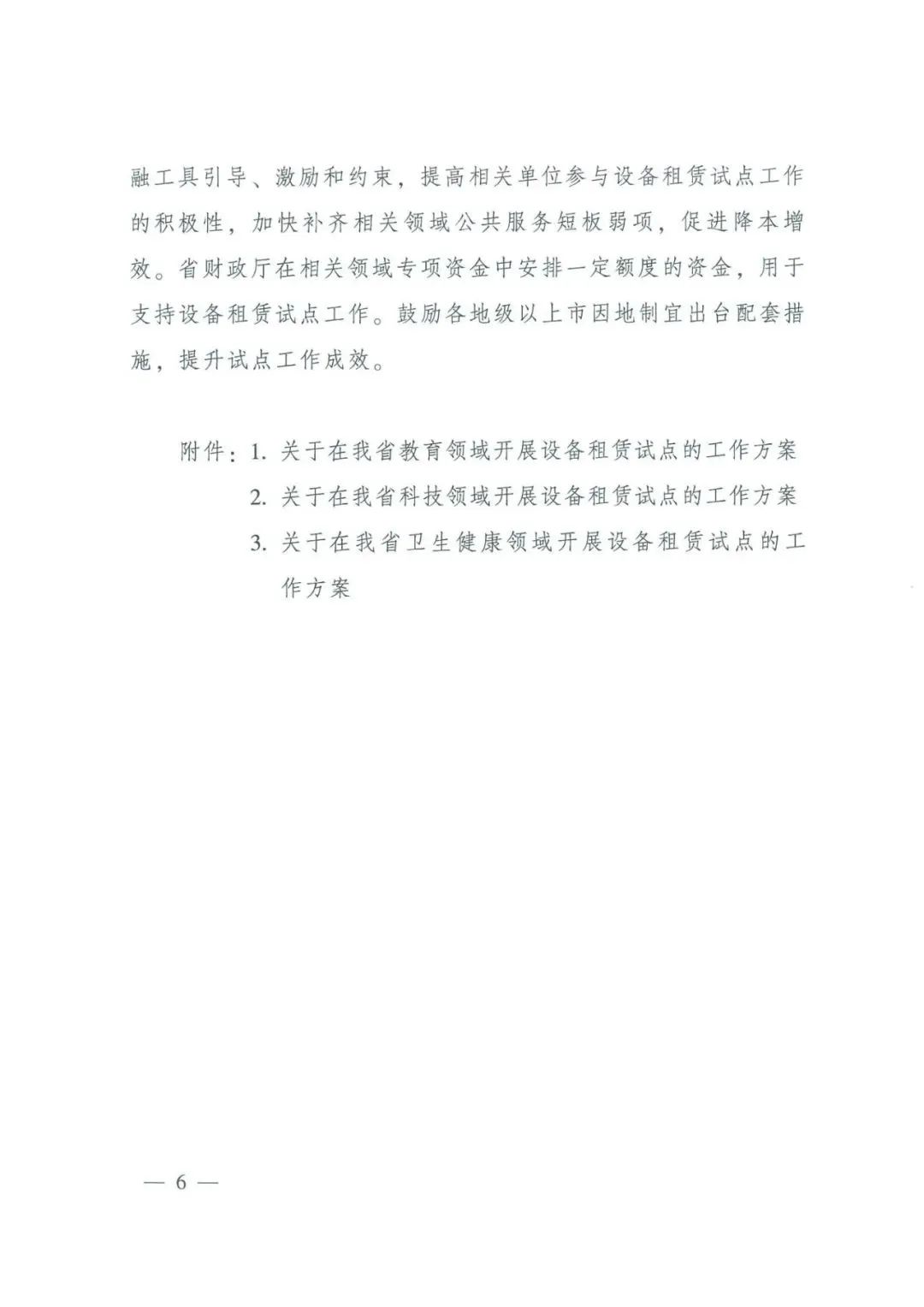 6、試點(diǎn)工作從全省公立學(xué)校、科研機(jī)構(gòu)、衛(wèi)生醫(yī)療機(jī)構(gòu)開始推進(jìn),通知還鼓勵(lì)其他特定領(lǐng)域參照省級(jí)試點(diǎn)方案推進(jìn)本領(lǐng)域設(shè)備租賃試點(diǎn)工作。